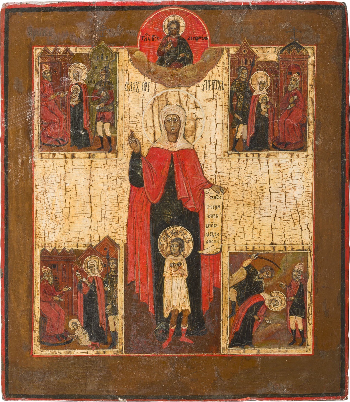 AN ICON OF ST. YULITTA AND HER SON KIRIK WITH SCENES FROM THEIR MARTYRDOM Russian, 19th century Tempera on wood panel. The background stripped to gesso, partially restored. 30.3 x 27 cm.