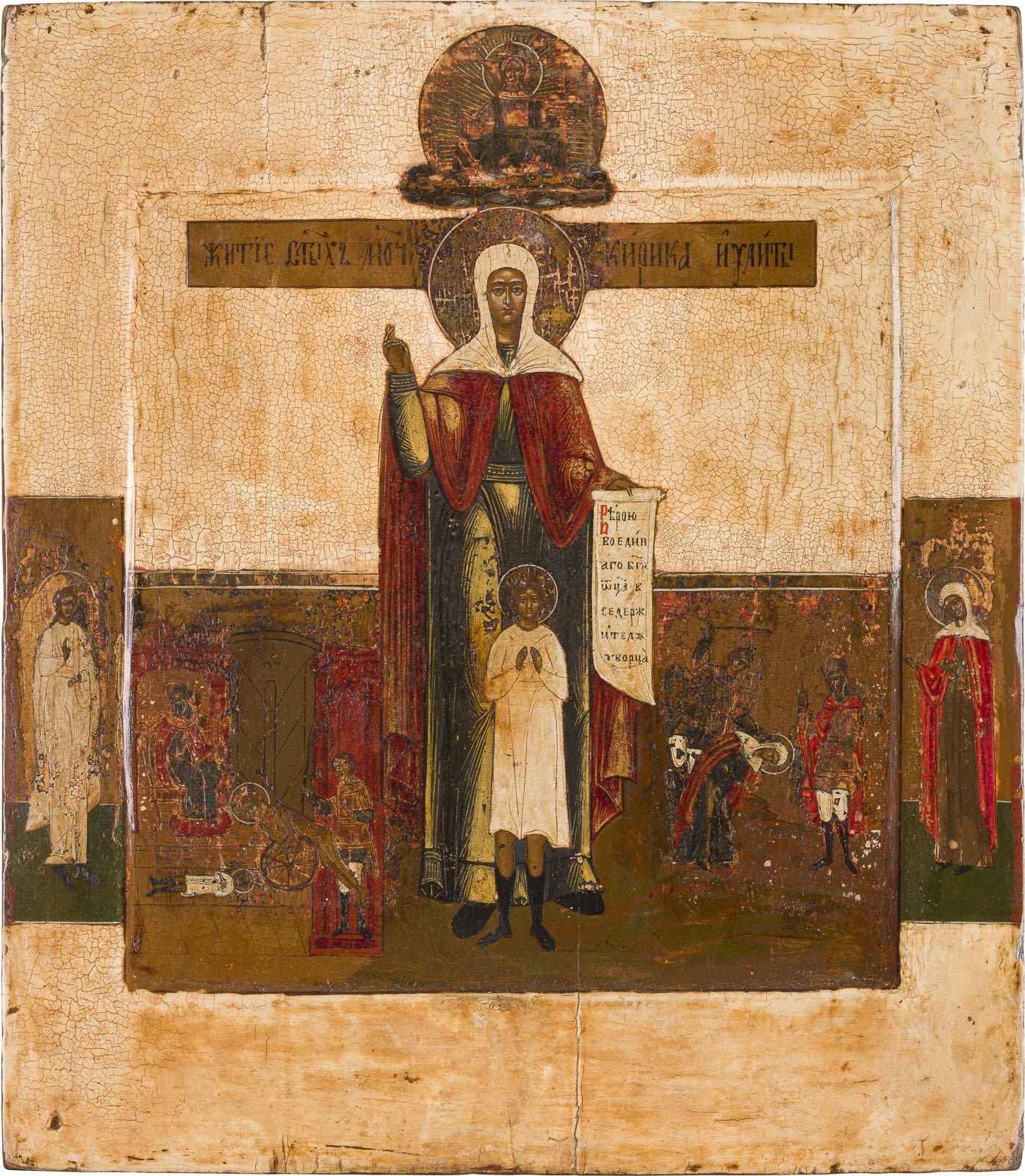 AN ICON SHOWING STS. YULITTA AND KIRK Russian, 19th century Tempera on wood panel with kovcheg. Two selected saints on the borders, the Guardian Angel among them. The background and border stripped to gesso, wearings, restored. 35.6 x 31.5 cm.