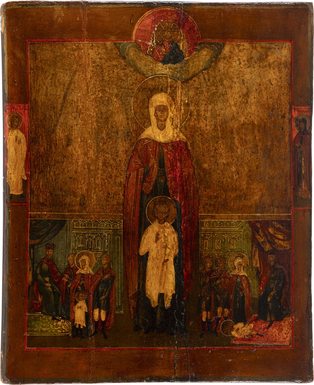 AN ICON SHOWING STS. YULITTA AND KIRIK Russian, 19th century Tempera on wood panel. The background made of silver, covered by a golden lacquer. Two selected saints on the borders, the Guardian Angel among them. Partially restored. 30.4 x 24.8 cm.