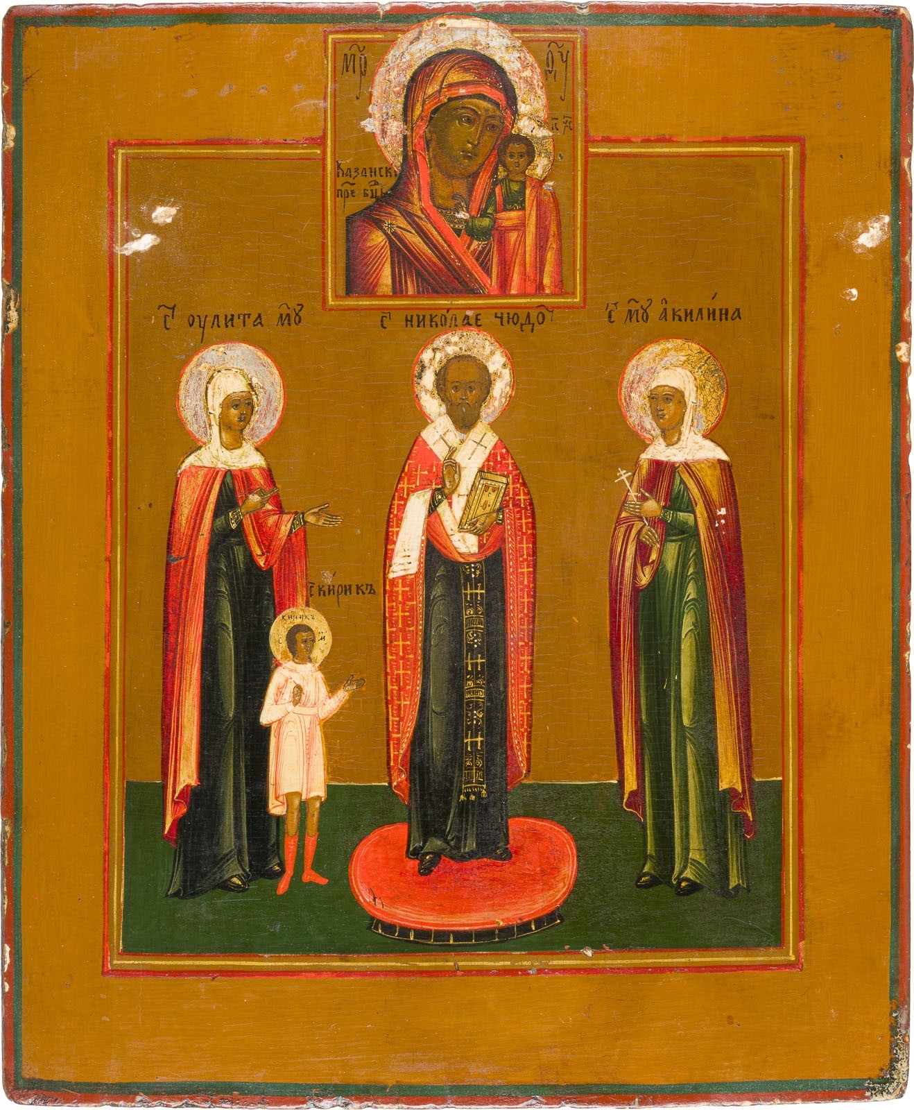 IKONE MIT DEN HEILIGEN JULITTA UND KIRIK, NIKOLAUS VON MYRA UND AKILINA MIT DER GOTTESMUTTER VON KASAN