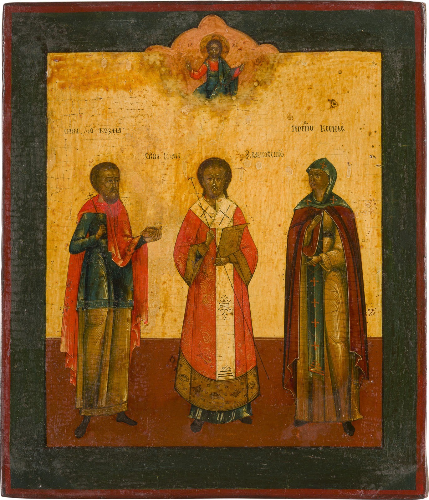 AN ICON SHOWING STS. COSMAS, JOHN CHRYSOSTOM AND KSENIA Russian, 19th century Tempera on wood panel. The borders partially restored. 30.3 x 26 cm.