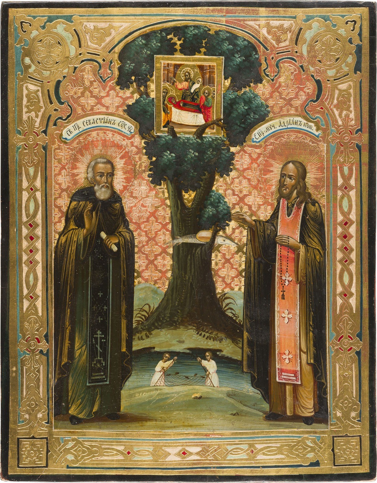 AN ICON WITH SAINTS SEVASTIAN OF SOSCHOT AND ADRIAN OF POSECHONIE Russian, dated 1897 (?) Tempera on wood panel, background gilded and ornamentally engraved. On the reverse a Cyrillic dedicatory inscription with erased date: "To the monastic brother Nikolai Smirnov with the blessing of Archbishop Ionathan [1897], June 9th." 30.8 x 24.1 cm.