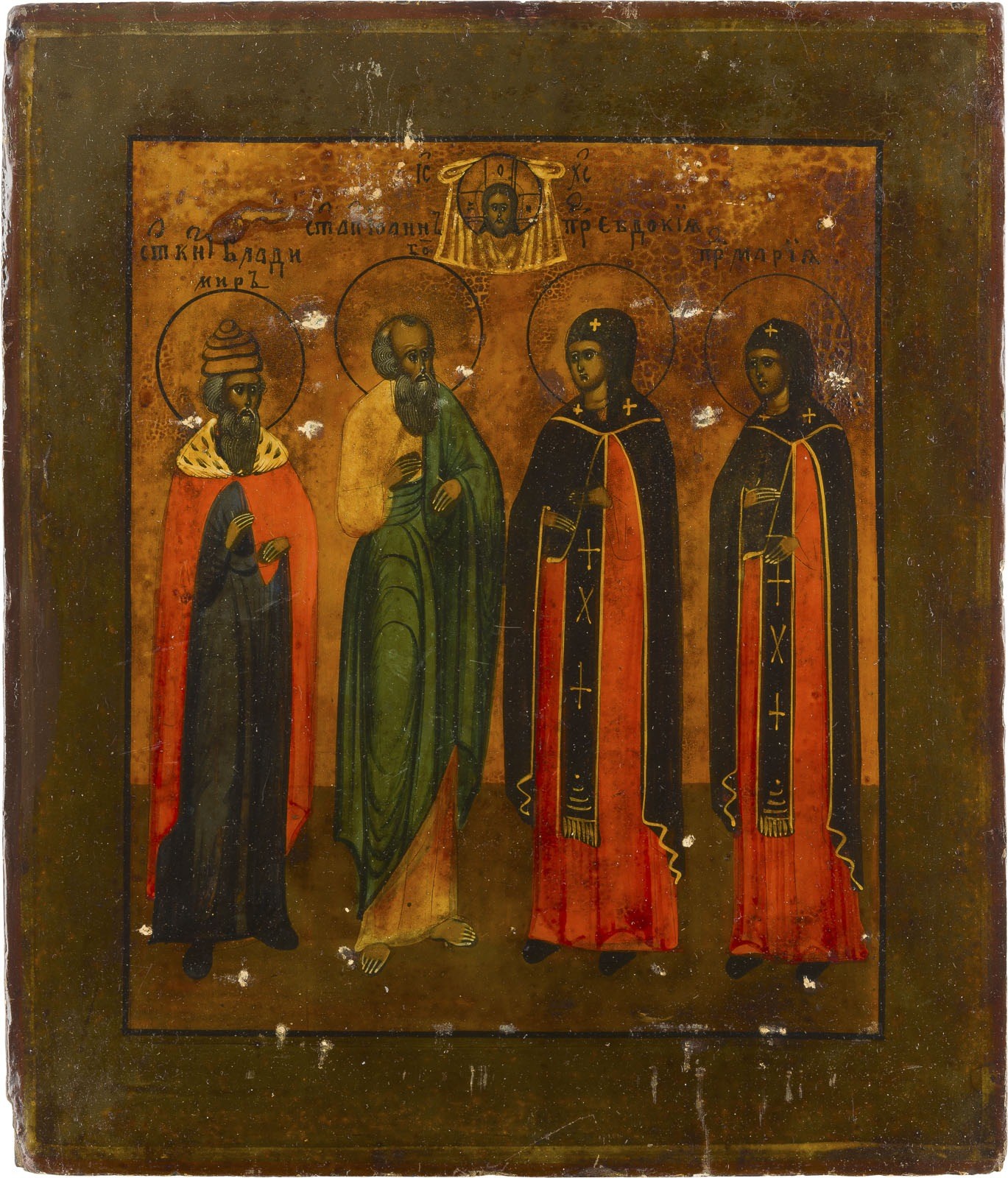 IKONE MIT DEN HEILIGEN WLADIMIR, JOHANNES DEM EVANGELISTEN, EUDOKIA UND MARIA MIT OKLAD