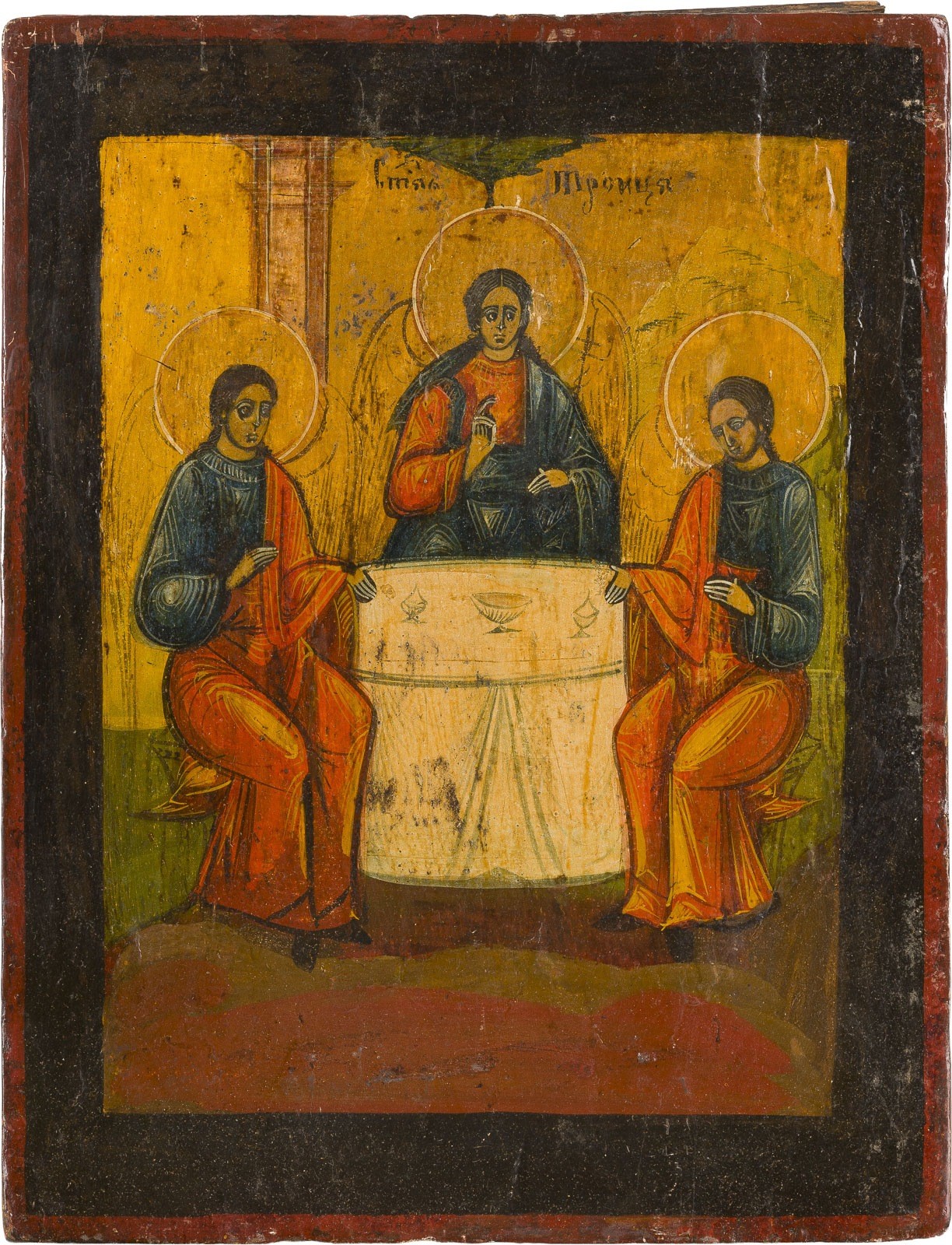 IKONE MIT DER ALTTESTAMENTLICHEN DREIFALTIGKEIT MIT OKLAD