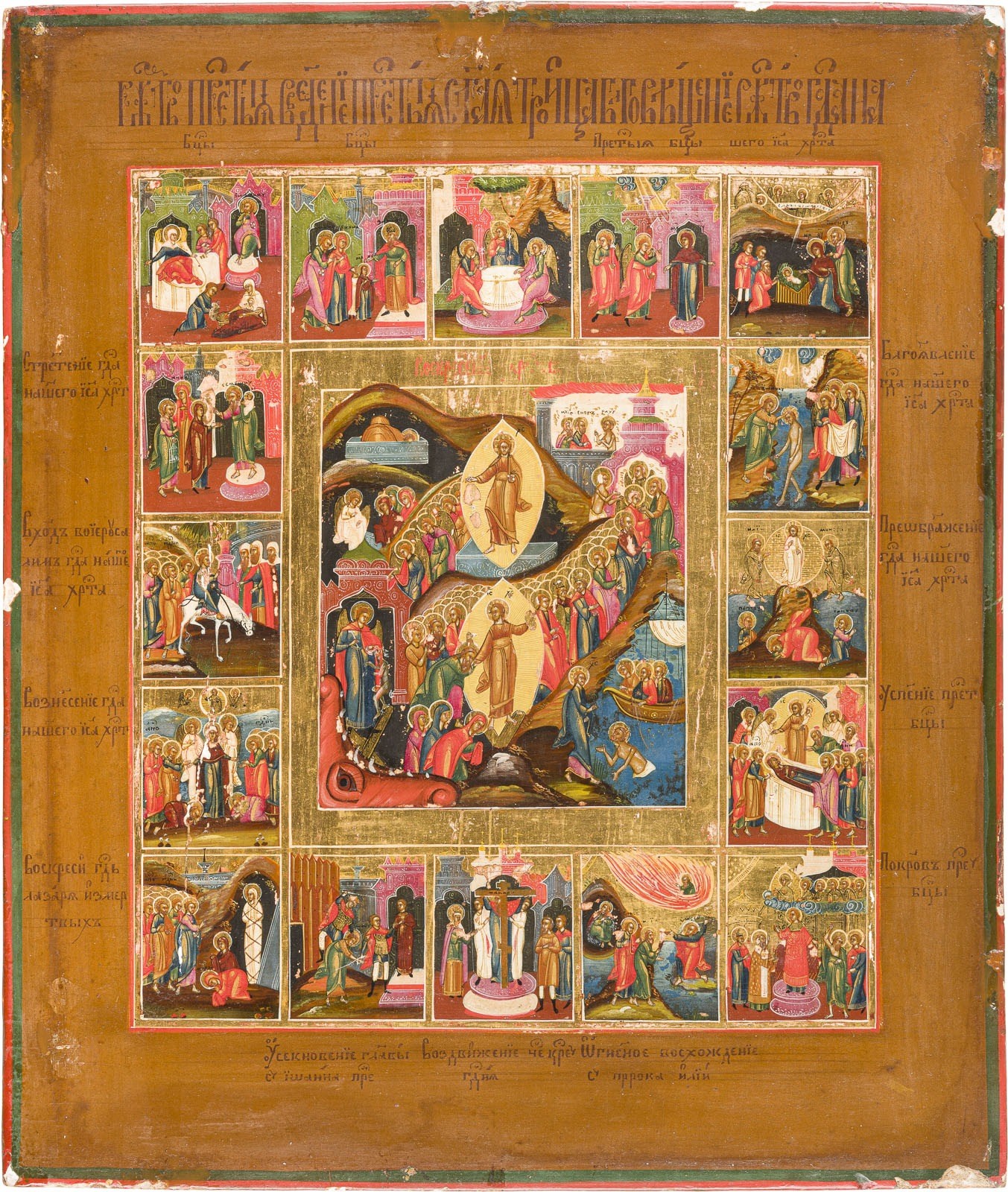AN ICON OF THE DESCENT INTO HELL AND THE RESURRECTION OF CHRIST AND THE MAJOR LITURGICAL FEASTS Russian, 19th century Tempera on wood panel with kovcheg. Finely painted in bright colours against a golden background. The edges minimally chipped. 36 x 30.8 cm.