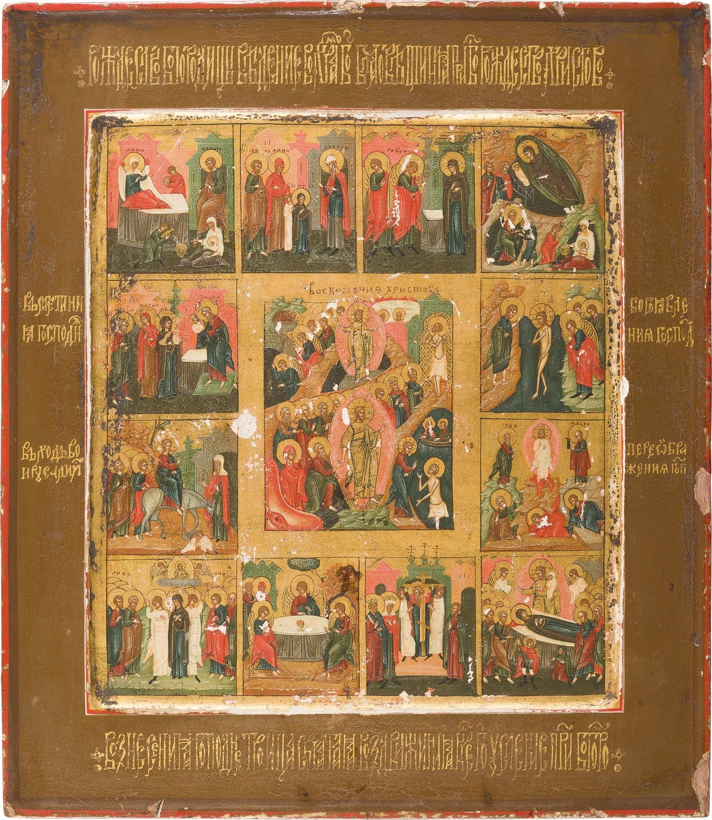 AN ICON SHOWING THE RESURRECTION OF CHRIST AND THE DESCENT INTO HELL WITH TWELVE MAJOR FEASTS Russian, late 19th century Tempera on wood panel with double kovcheg. Finely executed in great detail on a gold ground. Minor losses. 30.9 x 26.9 cm.