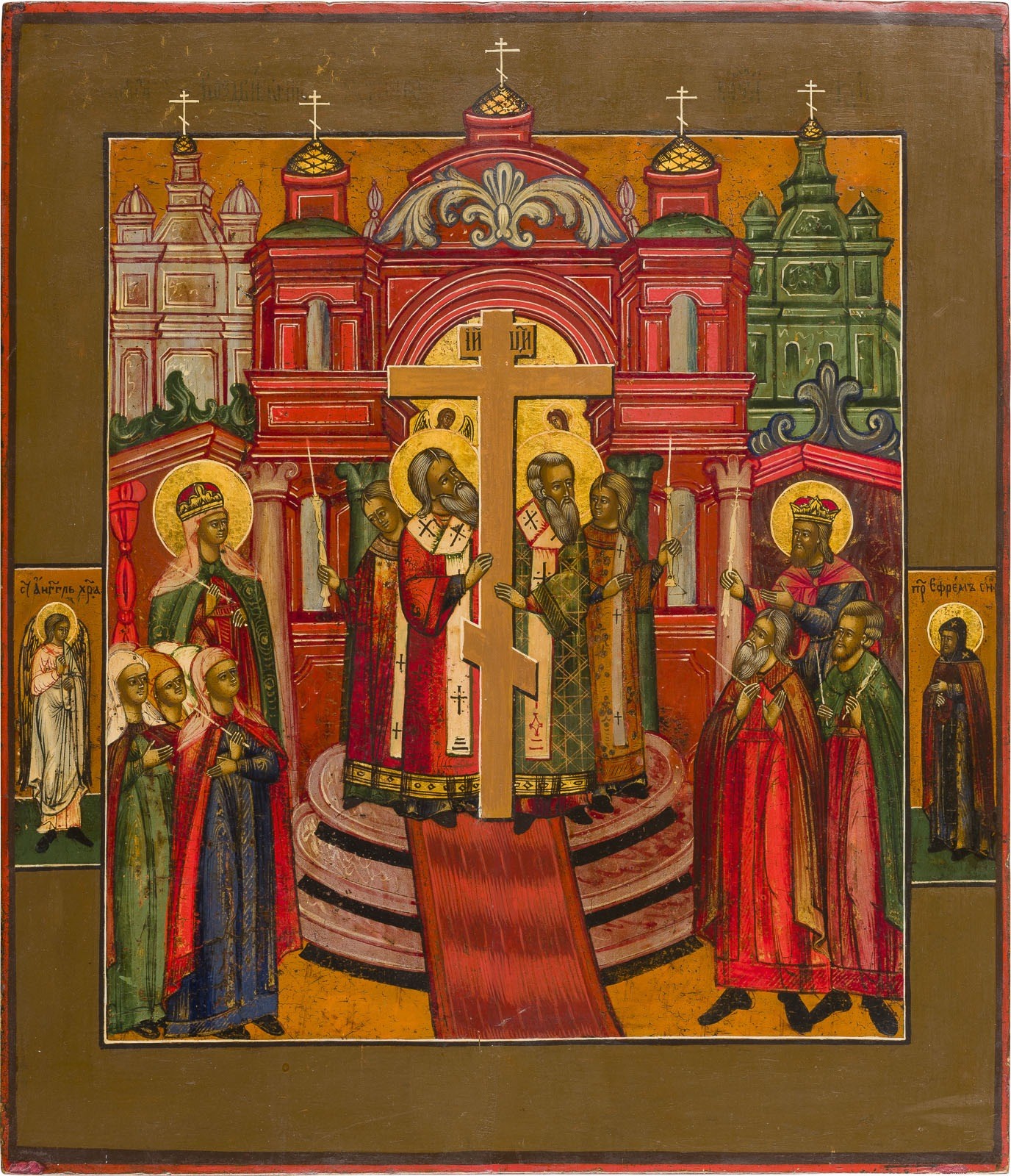 AN ICON SHOWING THE EXALTATION OF THE TRUE CROSS Russian, 19th century Tempera on wood panel. The haloes made of gold. Two selected saints on the borders, the Guardian Angel among them. Partially restored. 35.4 x 30.5 cm.