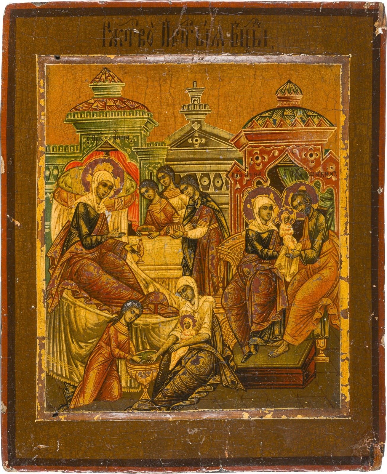AN ICON OF THE NATIVITY OF THE MOTHER OF GOD Russian, 19th century Tempera on wood panel with kovcheg, haloes and borders gilded. Losses. 30.3 x 25.3 cm.