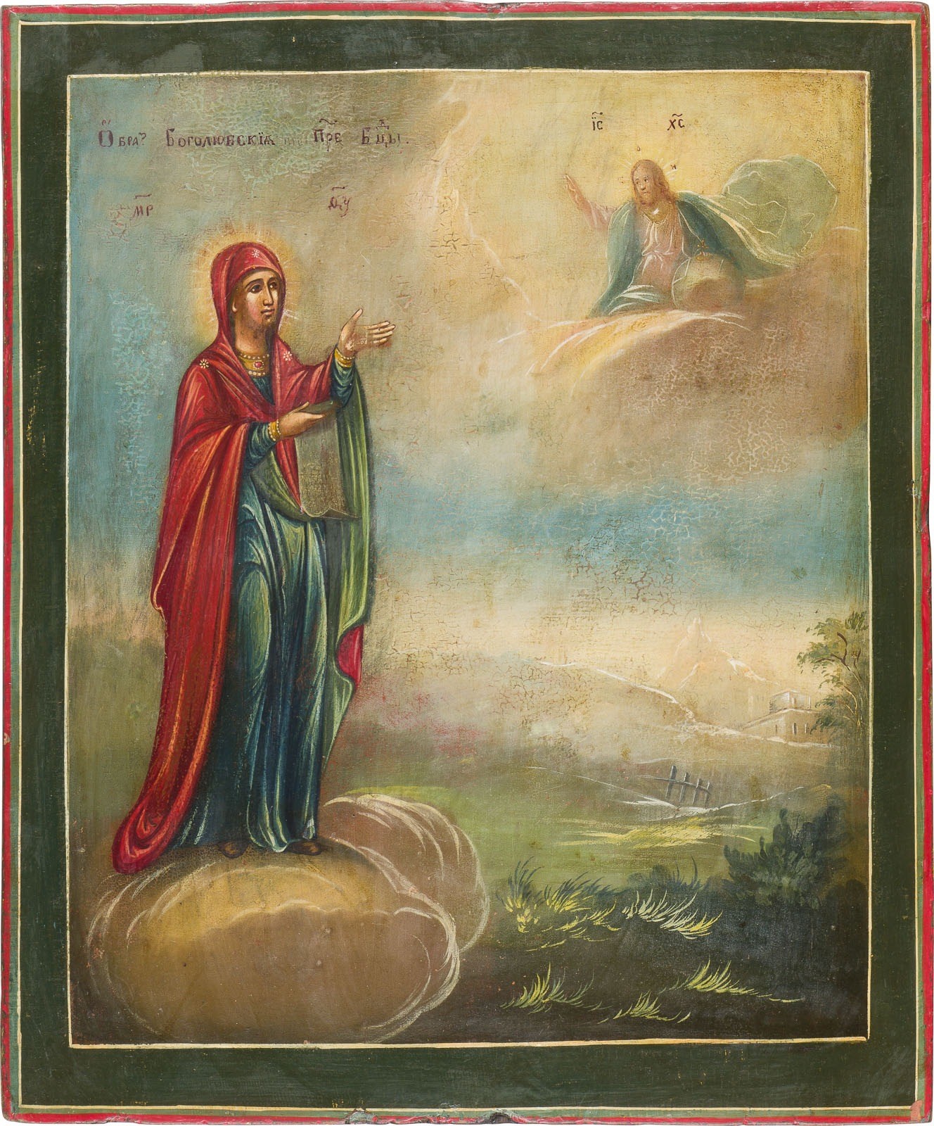 AN ICON SHOWING THE BOGOLUBSKAYA MOTHER OF GOD Russian, mid-19th century Oil on wood panel. Restored. 30.4 x 25.2 cm.