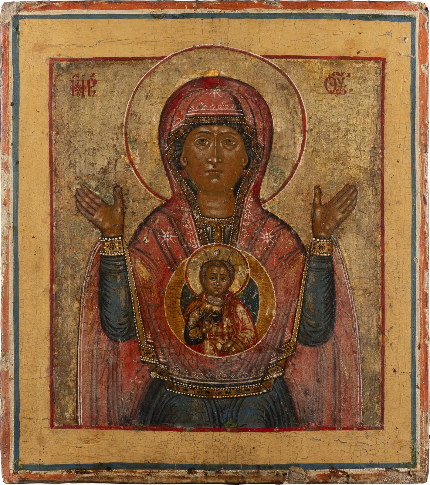 AN ICON OF THE MOTHER OF GOD OF THE SIGN (ZNAMENIE) Russian, 18th century Tempera on wood panel over canvas, with gilded haloes and background. Edges partly consolidated, minor restoration. 32.5 x 29 cm.