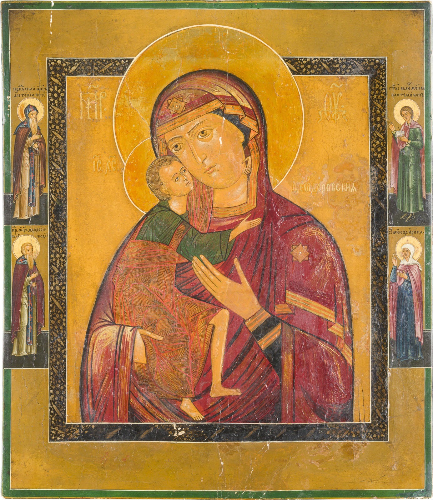 AN ICON SHOWING THE FEODOROVSKAYA MOTHER OF GOD Russian, Syzran, late 19th century Tempera on wood panel with kovcheg. The haloes made of silver, covered by a golden lacquer. Four selected saints on the borders, Sts. Panteleimon and Irina among them. Partially restored. 35.3 x 30.4 cm.