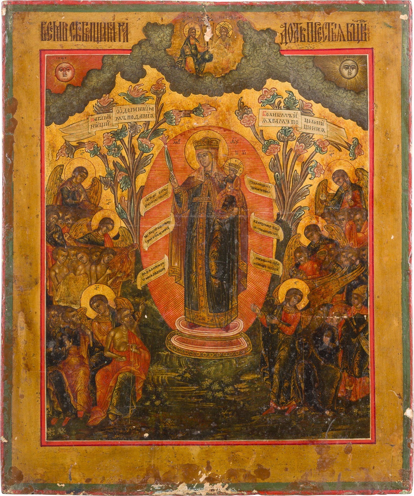 AN ICON SHOWING THE MOTHER OF GOD 'JOY TO ALL WHO GRIEVE' Russian, 18th century Tempera on wood panel. The haloes and background made of silver, covered by a golden lacquer. Wearings, partially restored. 40.5 x 34 cm.