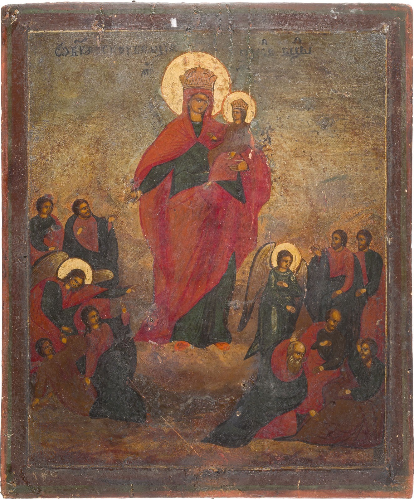 AN ICON SHOWING THE MOTHER OF GOD 'JOY TO ALL WHO GRIEVE' Russian, 19th century Tempera on wood panel. The haloes made of gold. Partially restored. 31.2 x 25.8 cm.