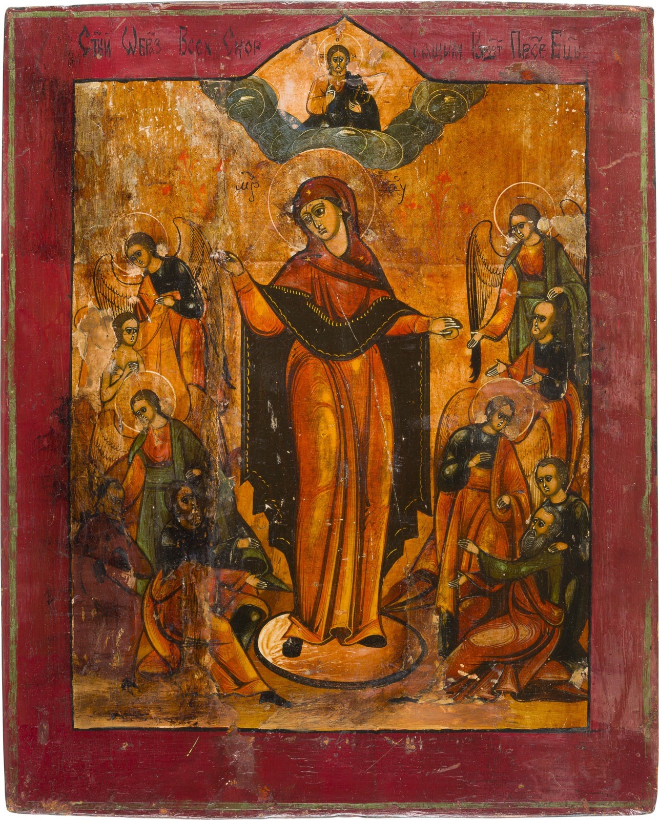 AN ICON SHOWING THE MOTHER OF GOD 'JOY TO ALL WHO GRIEVE' Russian, 19th century Tempera on wood panel. The background made of silver, covered by a golden lacquer. Vertical crack and border restored. 37.8 x 30.5 cm.