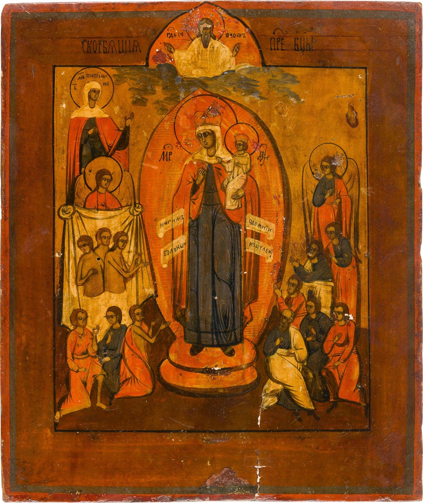 AN ICON SHOWING THE MOTHER OF GOD 'JOY TO ALL WHO GRIEVE' Russian, 19th century Tempera on wood panel. Minimally damaged. 30.8 x 26 cm.