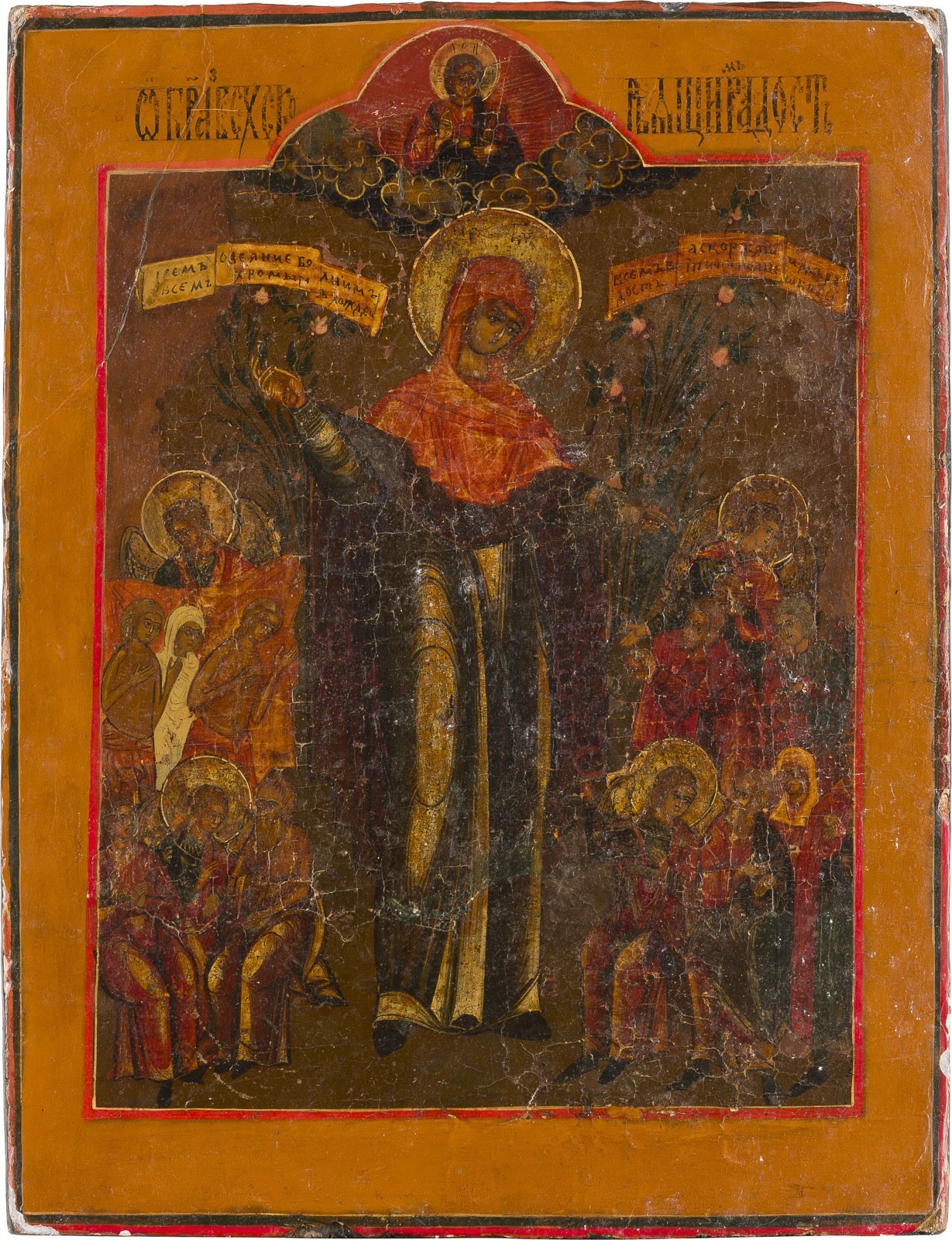 AN ICON SHOWING THE MOTHER OF GOD 'JOY TO ALL WHO GRIEVE' Russian, 19th century Tempera on wood panel. The haloes made of silver, covered by a golden lacquer. Areas of restoration. 30.2 x 23.2 cm.