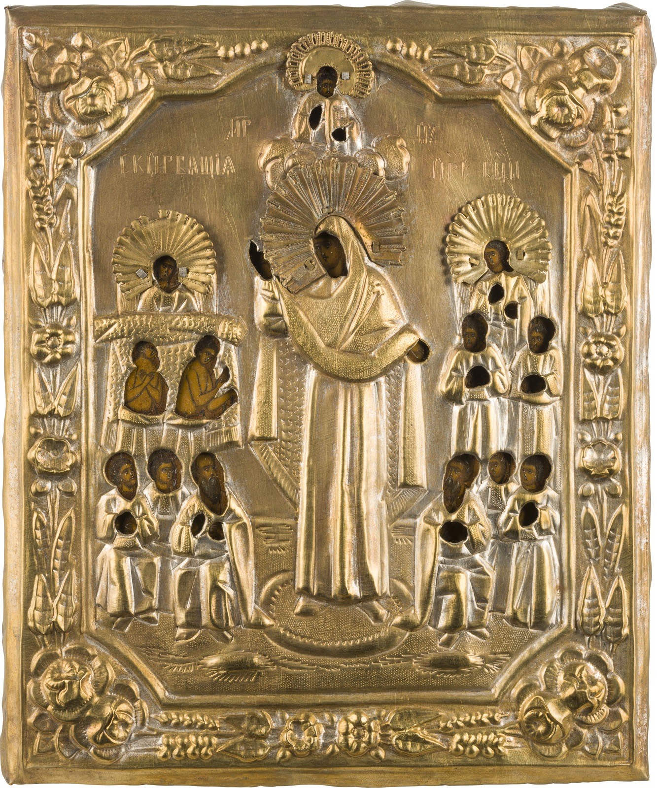 AN ICON SHOWING THE MOTHER OF GOD 'JOY TO ALL WHO GRIEVE' WITH OKLAD Russian, 19th century Tempera on wood panel. Overlaid with a chased brass oklad. 31 x 26 cm.