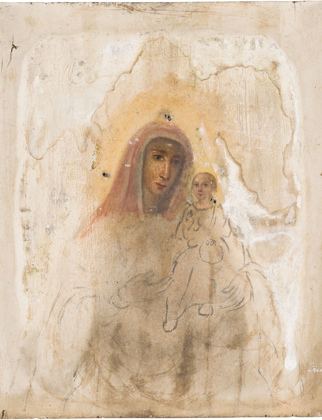 AN ICON OF THE MOTHER OF GOD HODEGETRIA WITH OKLAD Romanian, 19th century Oil on wood panel, with a metal oklad. 19 x 15.2 cm.