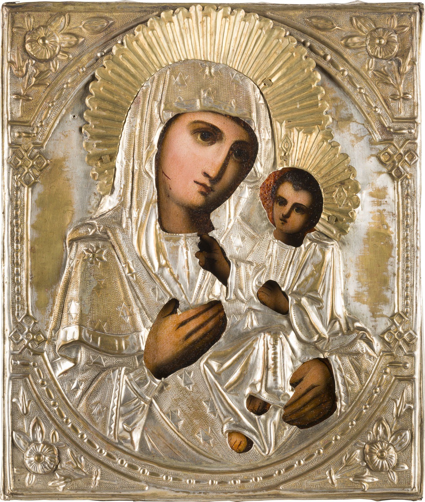 AN ICON SHOWING THE IVERSKAYA MOTHER OF GOD WITH OKLAD Russian, 2nd half of the 19th century Oil on wood panel with fabric backing. Overlaid with a chased brass oklad. 26.7 x 22.5 cm.