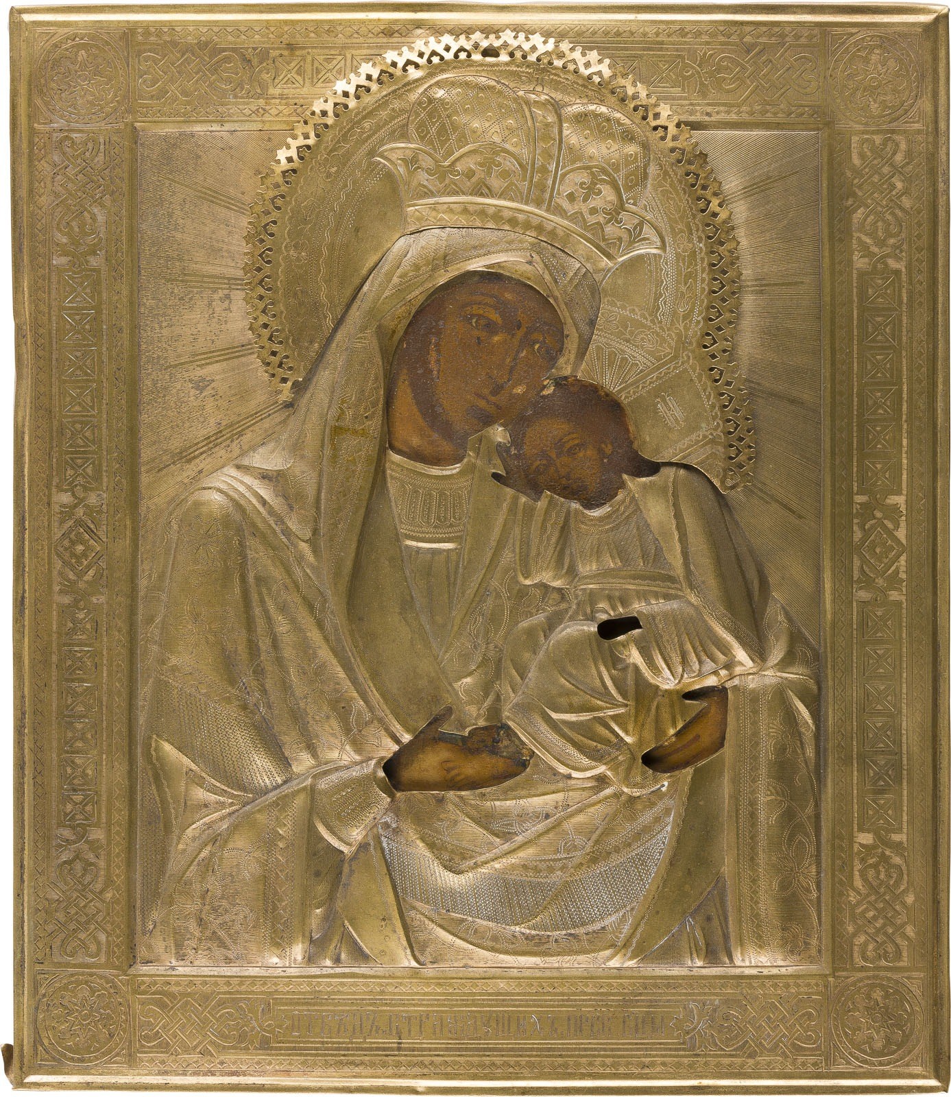 AN ICON SHOWING THE MOTHER OF GOD 'OF THE REMOVAL OF THE MISFORTUNES OF THE SUFFERING' WITH OKLAD Russian, 19th century Tempera on wood panel. Overlaid with an engraved brass oklad. Losses. 31.3 x 27 cm.