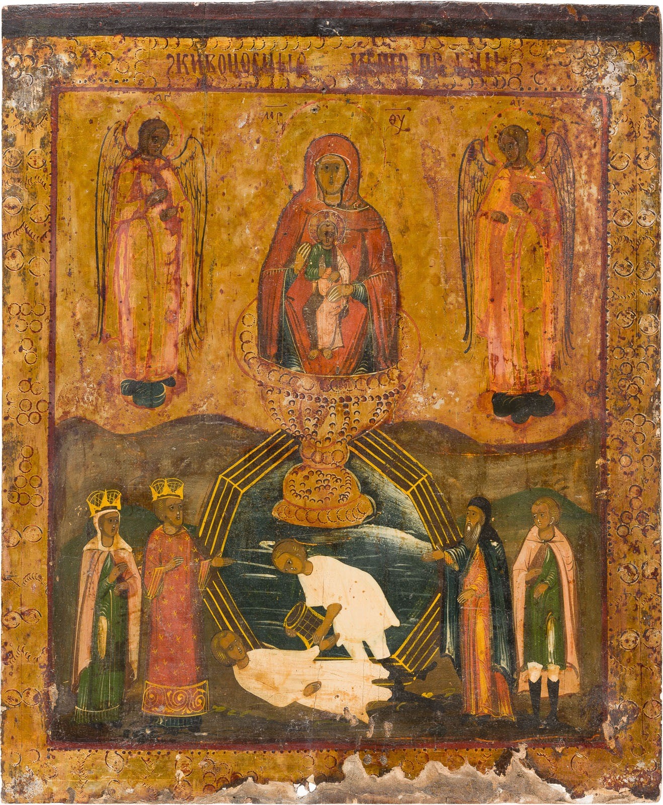 AN ICON SHOWING THE MOTHER OF GOD, SOURCE OF LIVE-GIVING WATER Russian, late 19th century Tempera on wood panel. The background made of silver, covered by a golden lacquer. The borders ornately punched. Losses to the borders, wearings, minimally restored. 34 x 28.2 cm.