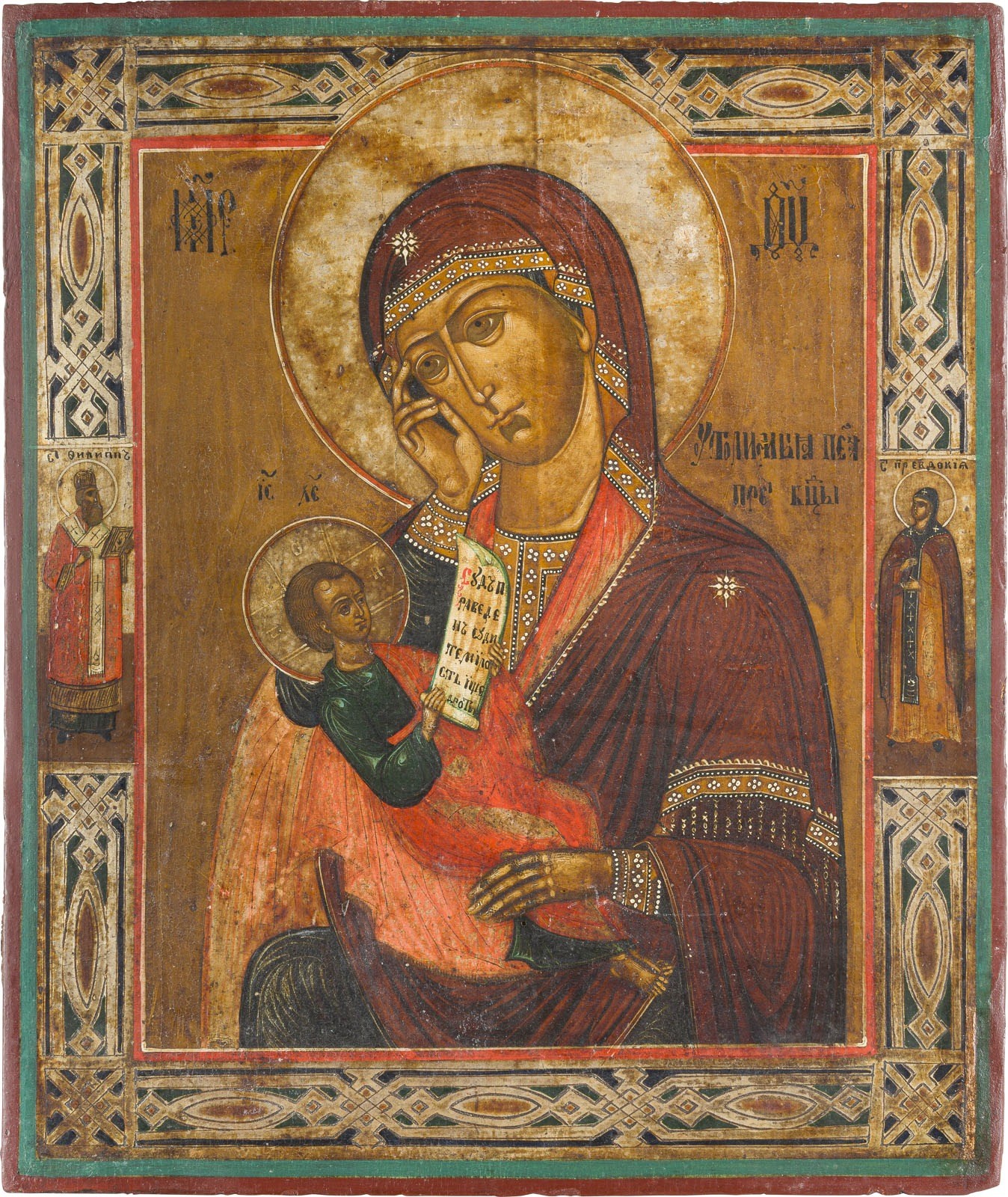 AN ICON OF THE MOTHER OF GOD 'SOOTHE MY SORROW' Russian, circa 1880 Tempera on wood panel, haloes and border silvered and glazed in gold, with ornamental engraving. With two saints on the borders: Saint Philip and Saint Eudokia. Slight rubbing. 30.9 x 26.2 cm.