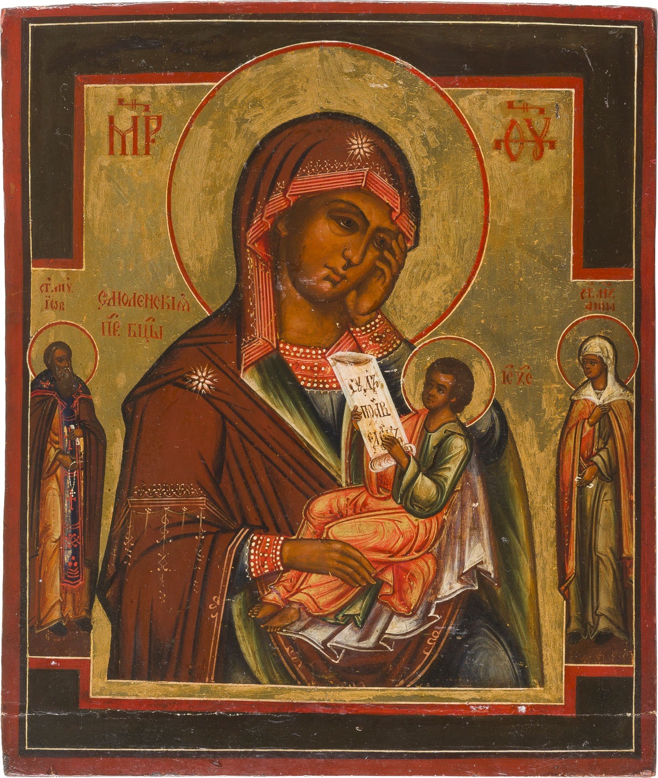 AN ICON SHOWING THE MOTHER OF GOD 'SOOTHE MY SORROW' Russian, circa 1800 Tempera on wood panel. The background made of silver, covered by a golden lacquer. Two selected saints on the borders. The lower border added later, partially restored. 33.5 x 28.7 cm.