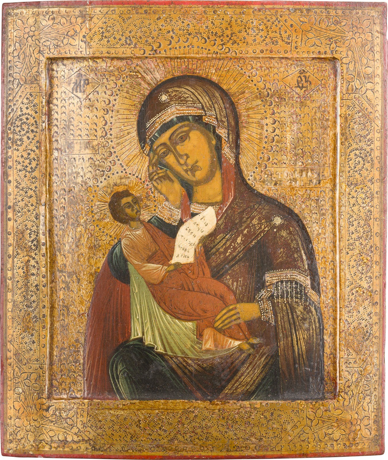 AN ICON SHOWING THE MOTHER OF GOD 'SOOTHE MY SORROW' Russian, circa 1880 Tempera on wood panel with kovcheg. The background made of silver, covered by a golden lacquer. The background and border gilded and incised to resemble a chased gilded silver oklad. Partially restored. 35.2 x 30.5 cm.