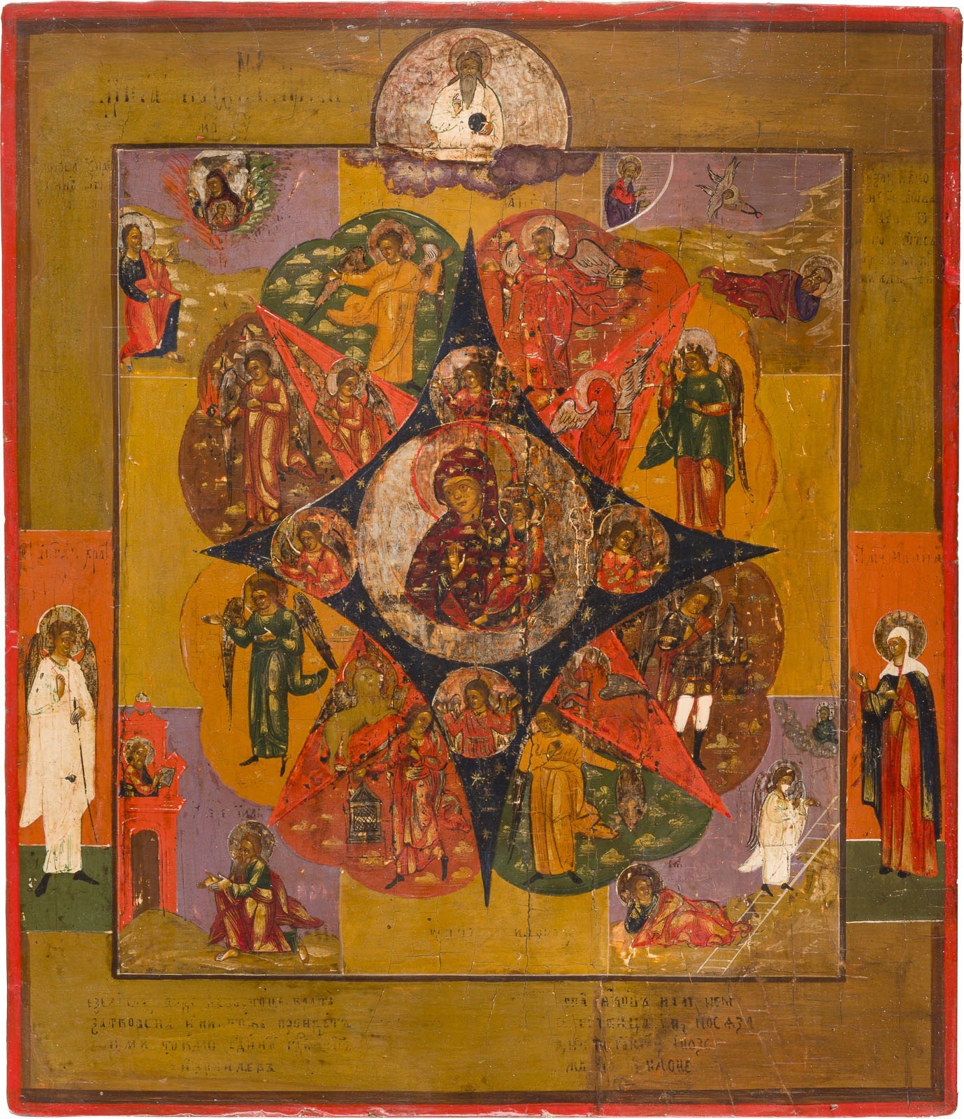 AN ICON SHOWING THE MOTHER OF GOD 'THE UNBURNT THORNBUSH' Russian, mid-19th century Tempera on wood panel with kovcheg. The haloes made of silver. Two selected saints on the borders, the Guardian Angel among them. Restorations. 35.1 x 30.6 cm.