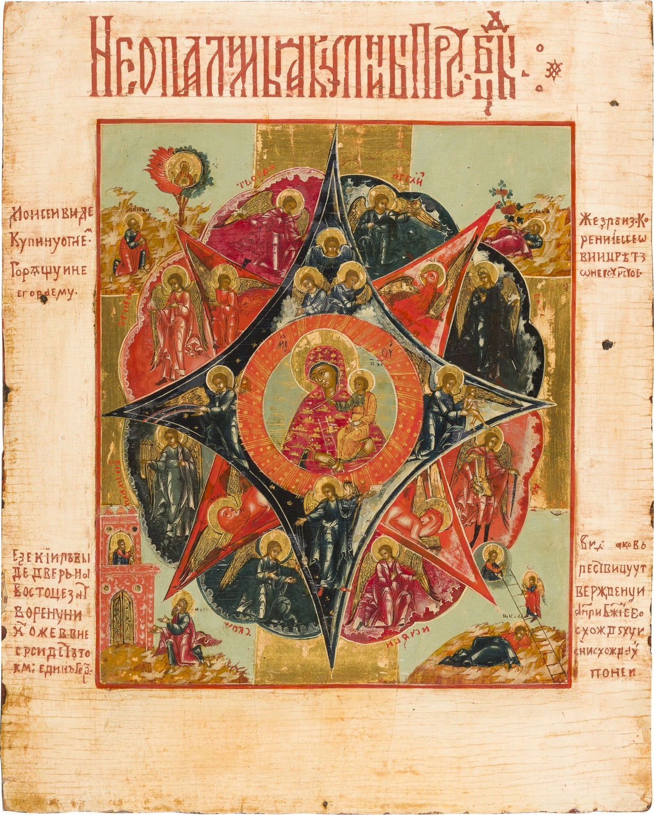 AN ICON SHOWING THE MOTHER OF GOD 'THE UNBURNT THORNBUSH' Russian, early 19th century Tempera on wood panel with kovcheg. Finely executed in bright colours against a gold background. The border stripped to gesso. 35.3 x 28.5 cm.