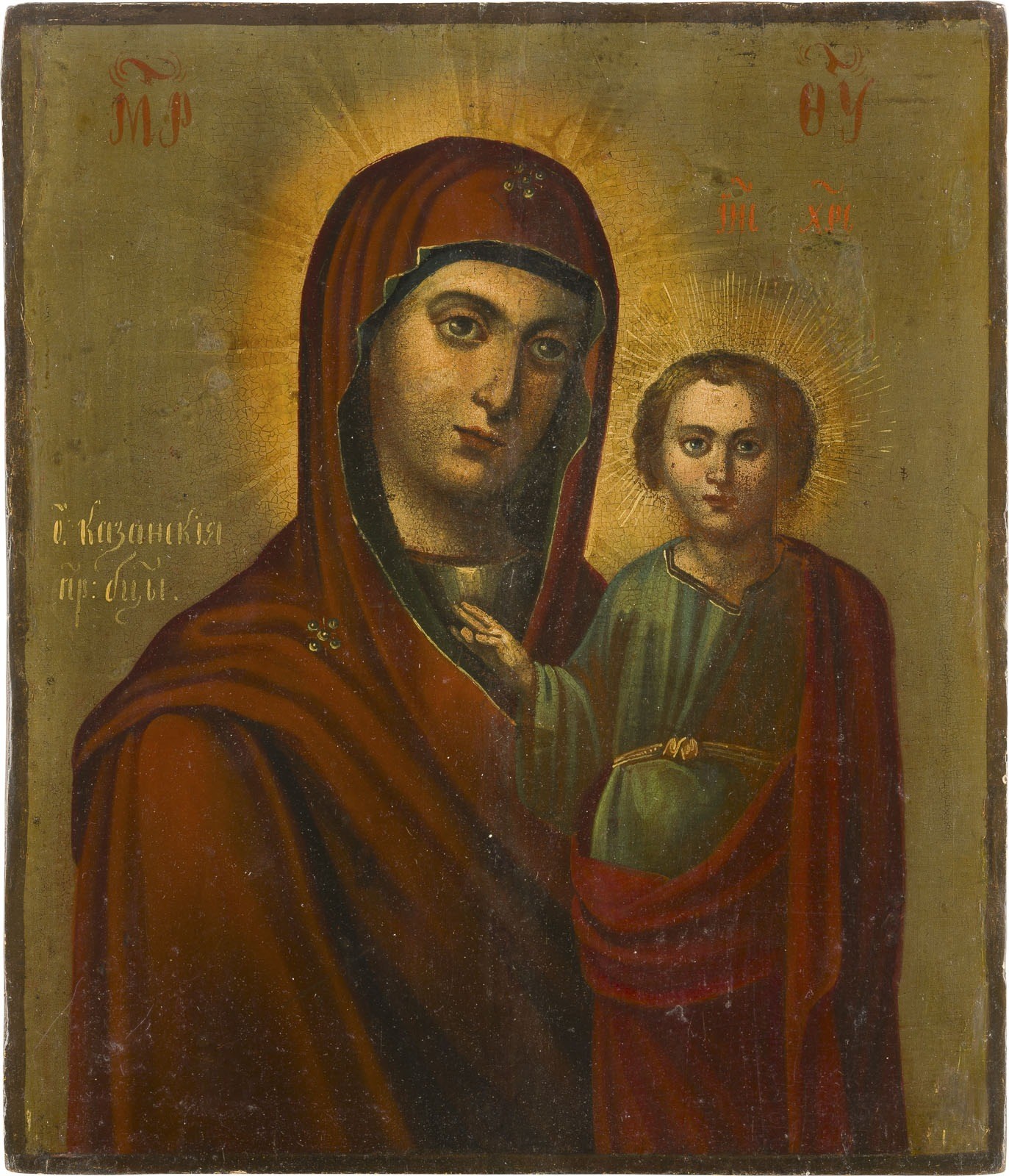 AN ICON SHOWING THE KAZANSKAYA MOTHER OF GOD Russian, mid 19th century Oil on wood panel. Vertical crack minimally restored. 33.5 x 28.9 cm.