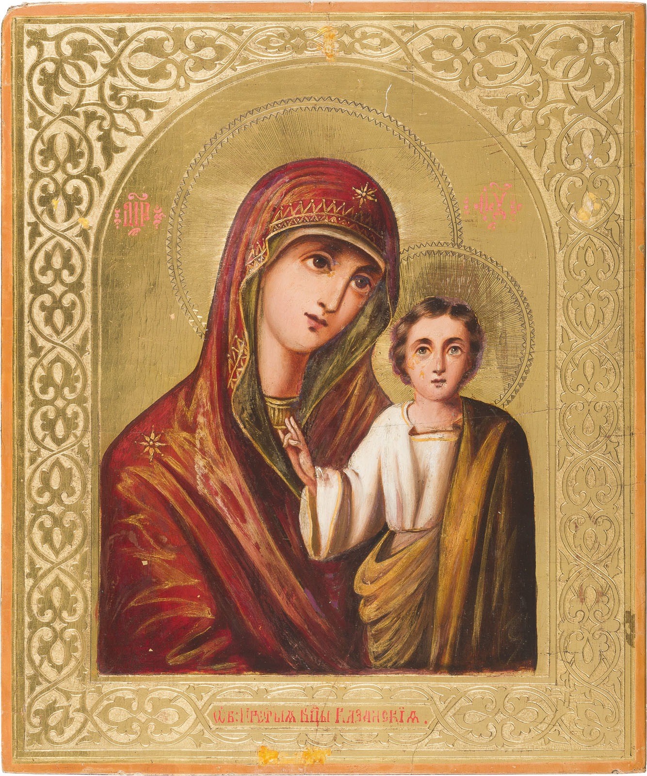 AN ICON SHOWING THE KAZANSKAYA MOTHER OF GOD Russian, late 19th century Oil on wood panel. Painted on a gold ground. The border incised with scrolling foliage. Minor areas of retouching. 31.1 x 26 cm.