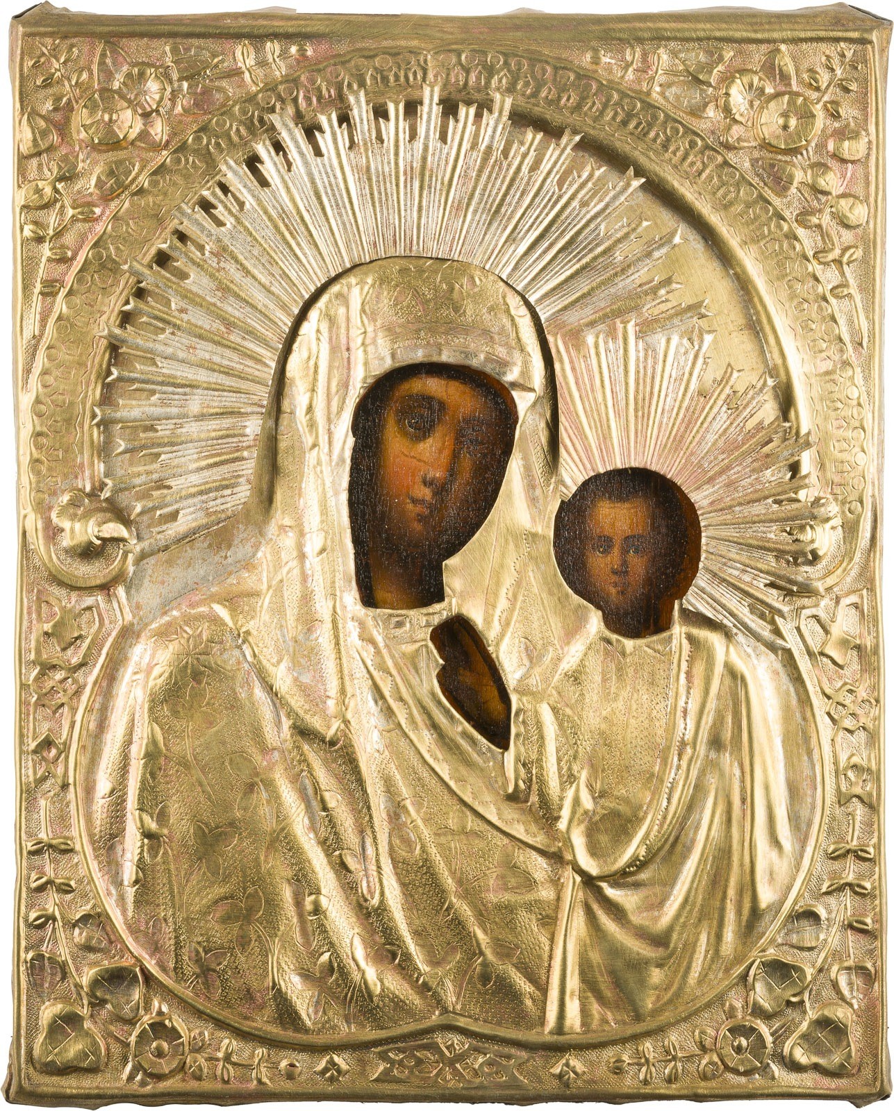 AN ICON SHOWING THE KAZANSKAYA MOTHER OF GOD WITH OKLAD Russian, mid-19th century Oil on wood panel. Overlaid with a chased brass oklad. 26.5 x 21.5 cm.