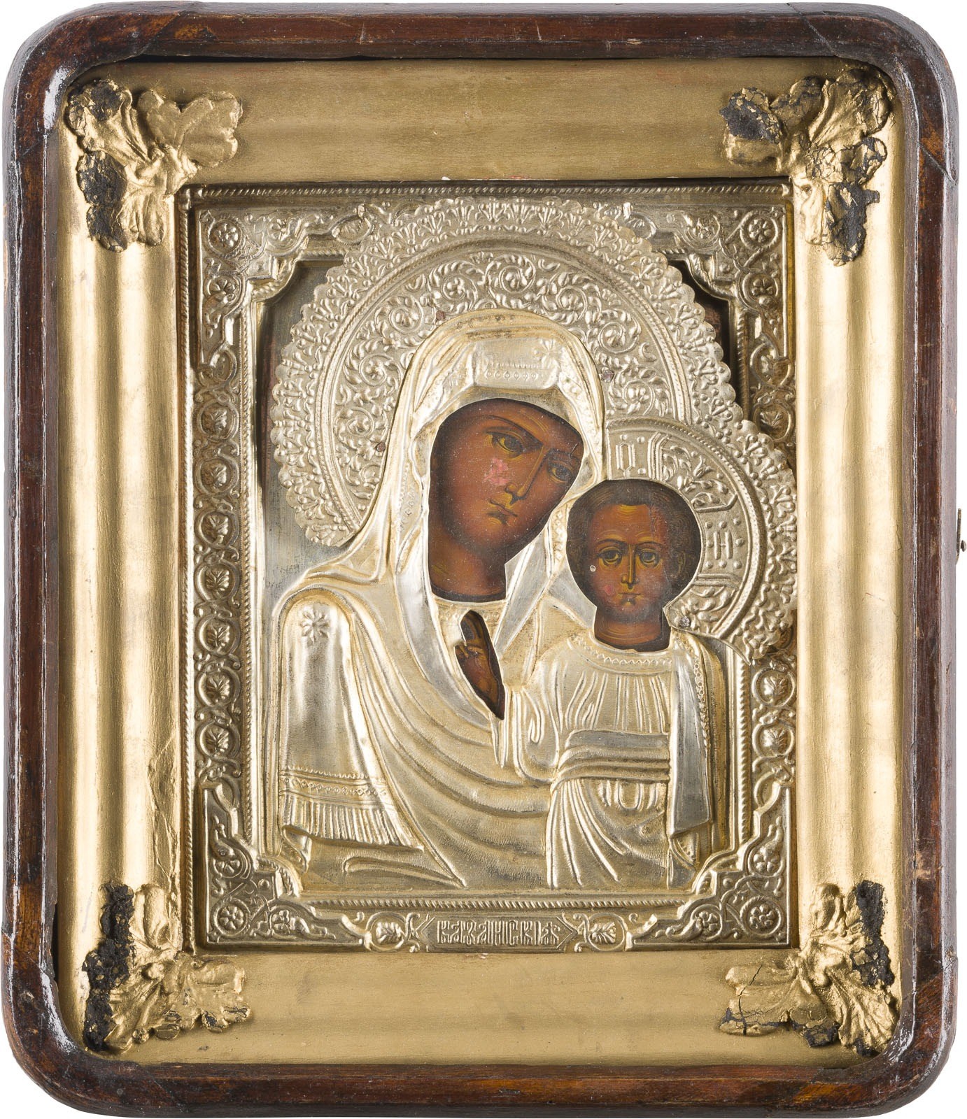 AN ICON SHOWING THE KAZANSKAYA MOTHER OF GOD WITH OKLAD WITHIN KYOT Russian, 2nd half 19th century Tempera on wood panel with cloth backing. Overlaid with a chased metal oklad. Minor losses. 30 x 25.5 cm (with kyot).