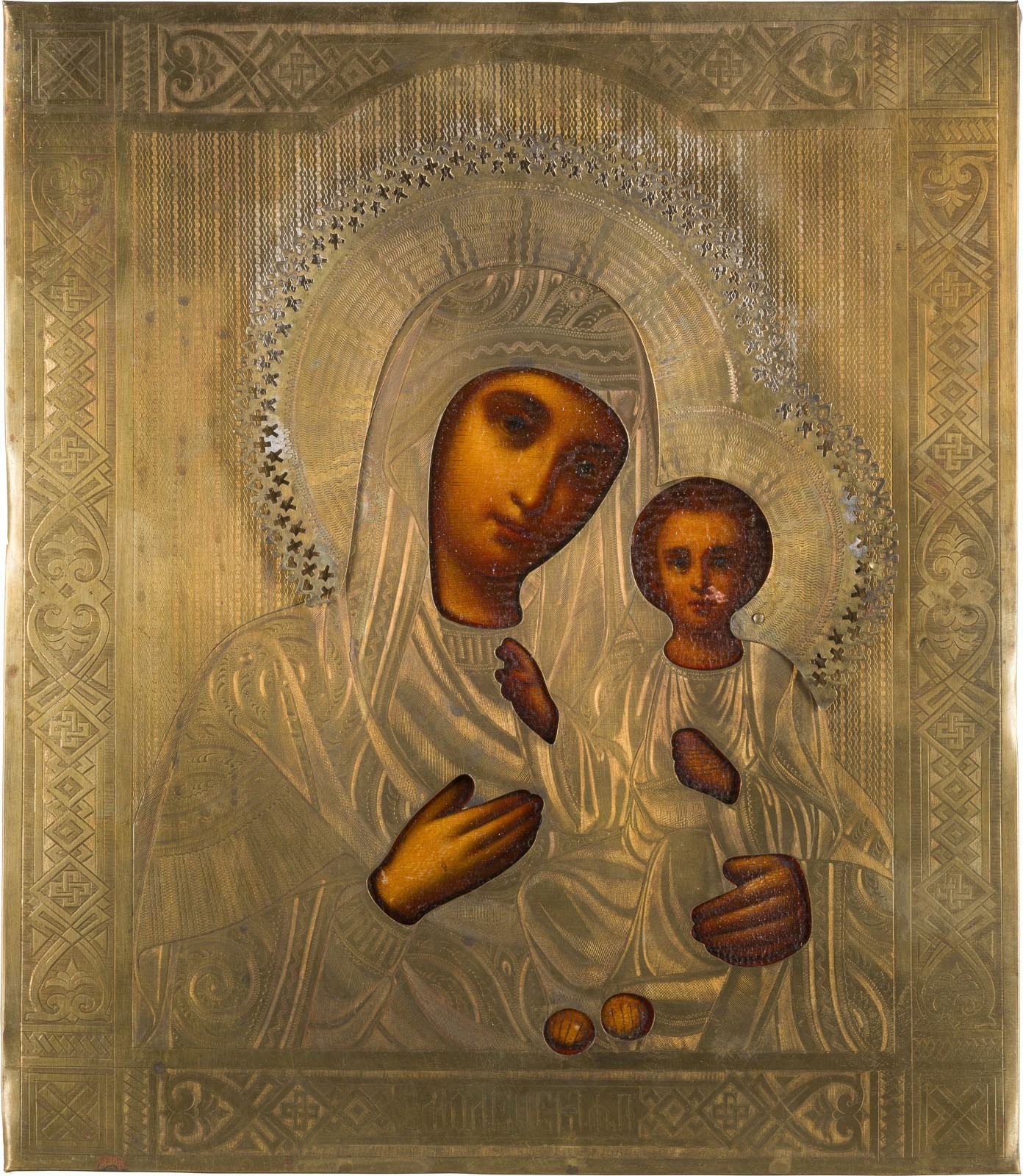 AN ICON SHOWING THE SMOLENSKAYA MOTHER OF GOD WITH OKLAD Russian, circa 1900 Oil on wood panel with fabric backing. The brass oklad with etched geometric design on the borders and rayed, cut-out halo. 31.1 x 26.7 cm.