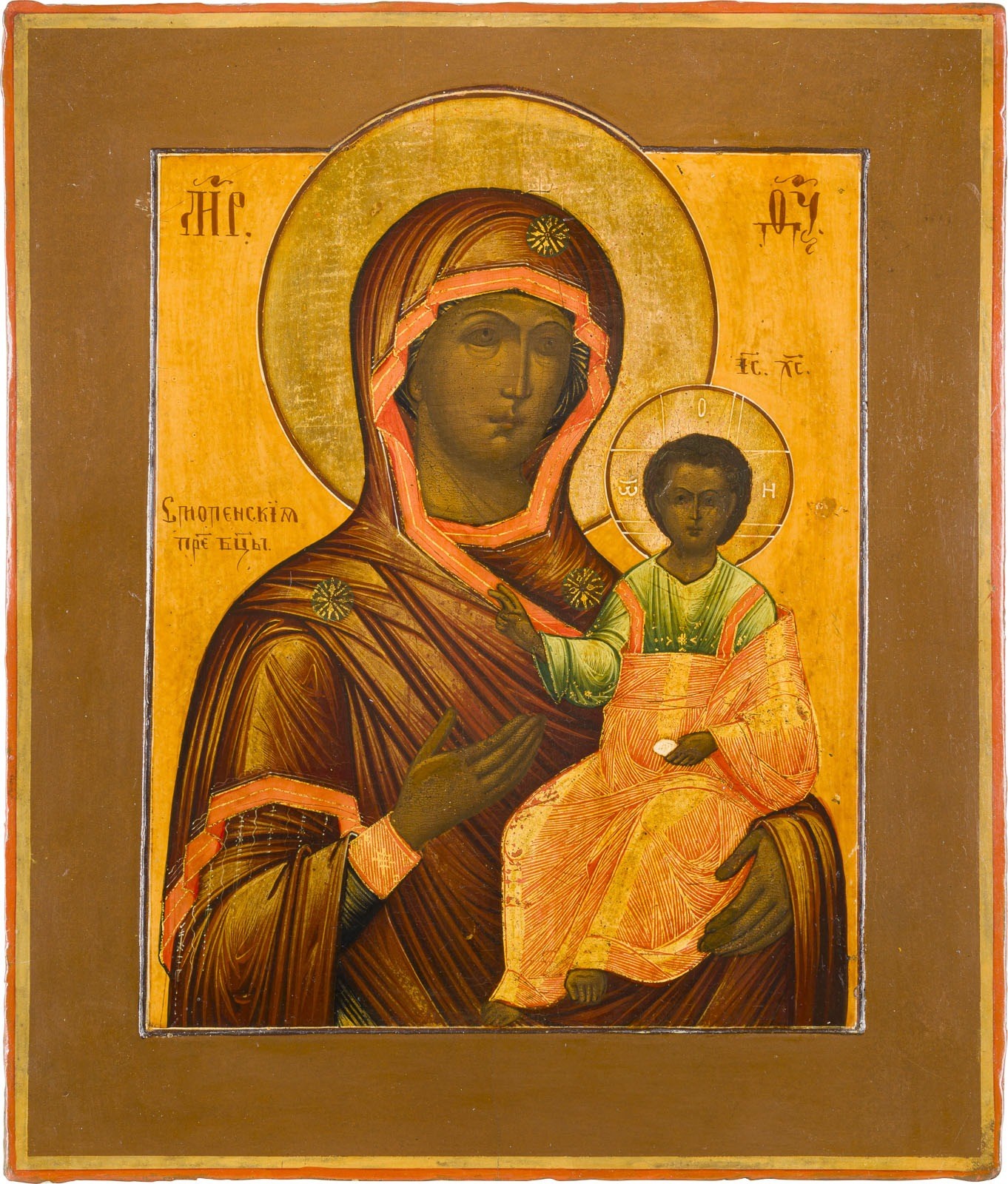 AN ICON OF THE MOTHER OF GOD OF SMOLENSK Russian, 19th century Tempera on wood panel with kovcheg, gilded haloes and chrysography. Partly restored. 31 x 26.3 cm.