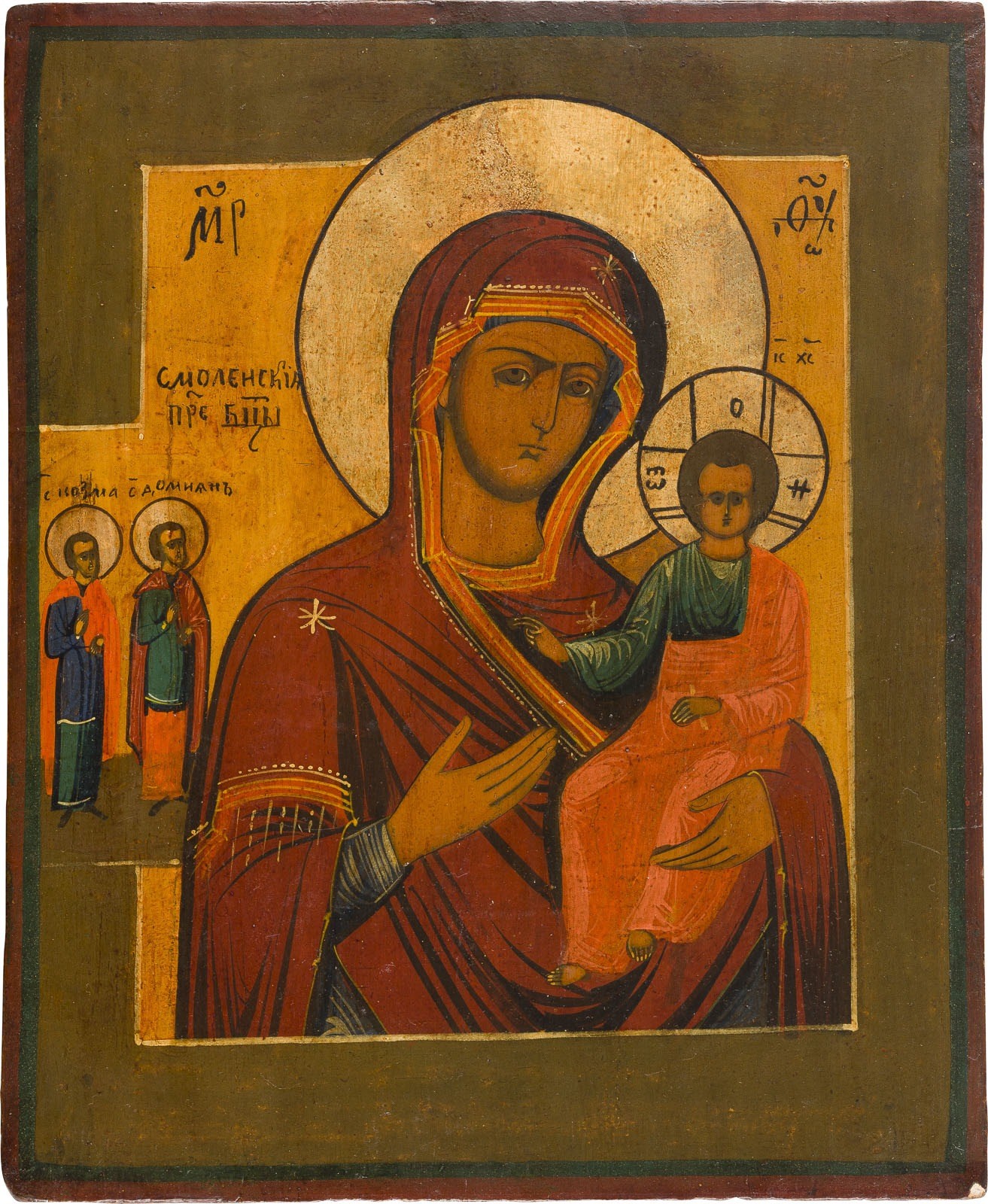 AN ICON SHOWING THE MOTHER OF GOD OF SMOLENSK AND STS. COSMAS AND DAMIAN Russian, 19th century Tempera on wood panel. The haloes made of silver, covered by a golden lacquer. Partially restored. 32.2 x 26.2 cm.