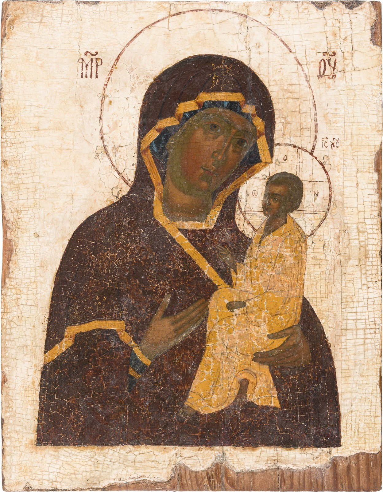 AN ICON SHOWING THE TIKHVINSKAYA MOTHER OF GOD Russian, 17th century Tempera on wood panel. The background stripped to the gesso, losses. 29.7 x 22.8 cm.
