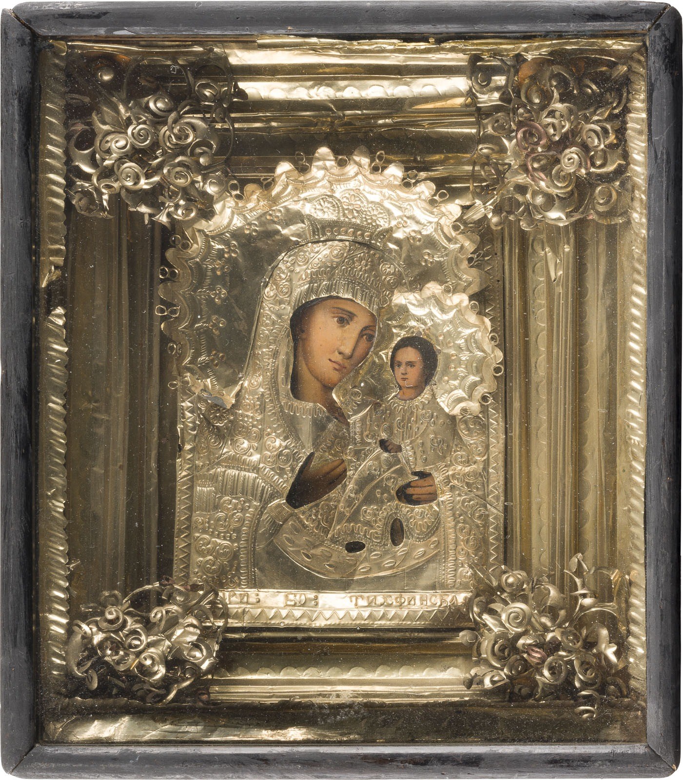 AN ICON SHOWING THE TIKHVINSKAYA MOTHER OF GOD WITH OKLAD WITHIN KYOT Ukraine, 19th century Oil on wood panel. Overlaid with metal foil. 34.4 x 30.2 cm (including glazed kyot).