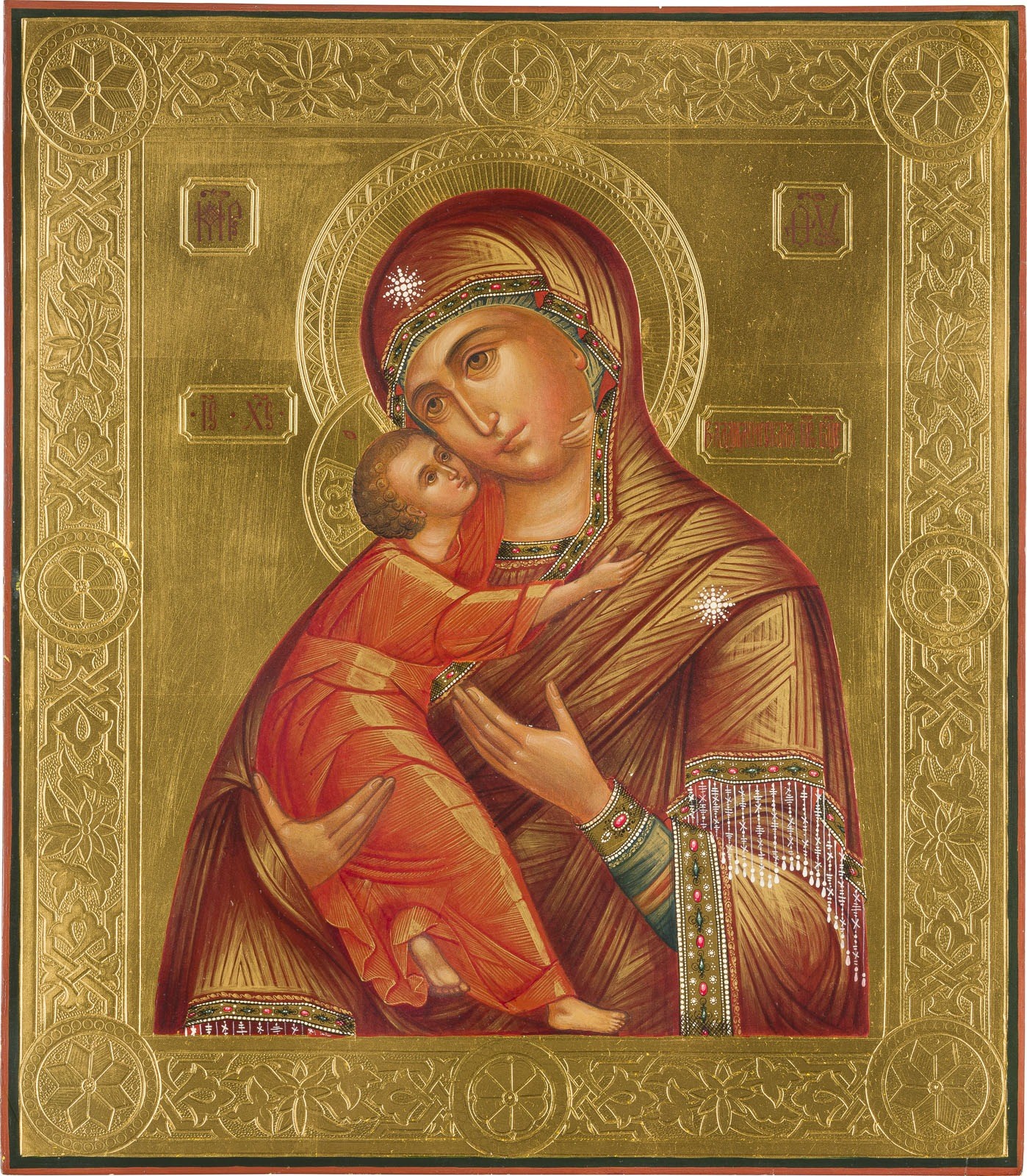AN ICON SHOWING THE VLADIMIRSKAYA MOTHER OF GOD Recent Tempera on wood panel. Painted with bright colours on a gold background, the border ornately punched. 30.7 x 27 cm.