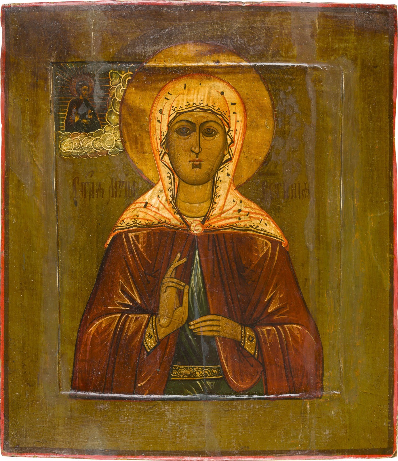 AN ICON SHOWING ST. PHOTINIYA Russian, late 19th century Tempera on wood panel with kovcheg. The halo made of silver, covered by a golden lacquer. Minimally restored. 35.2 x 30.8 cm.