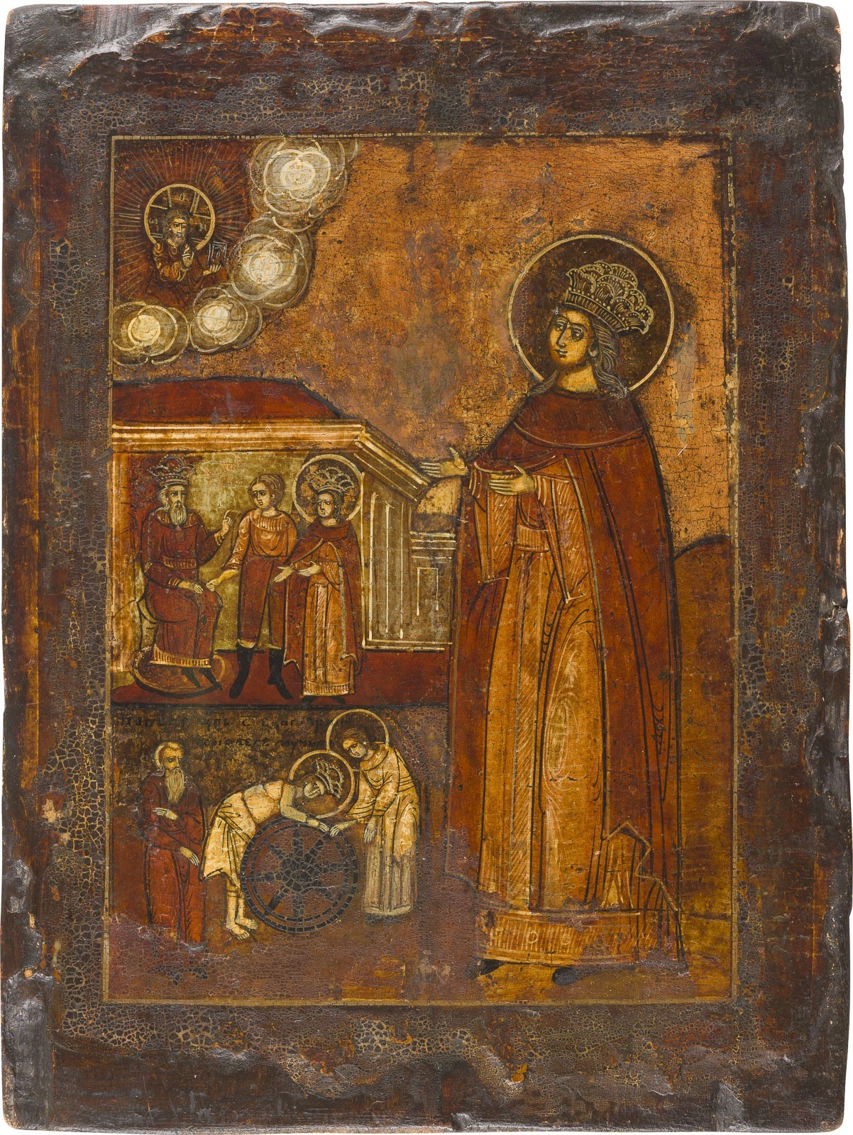 AN ICON SHOWING ST. CATHERINE AND HER MARTYRDOM Russian, 18th century Tempera on wood panel. Restorations. 31.8 x 23.7 cm.