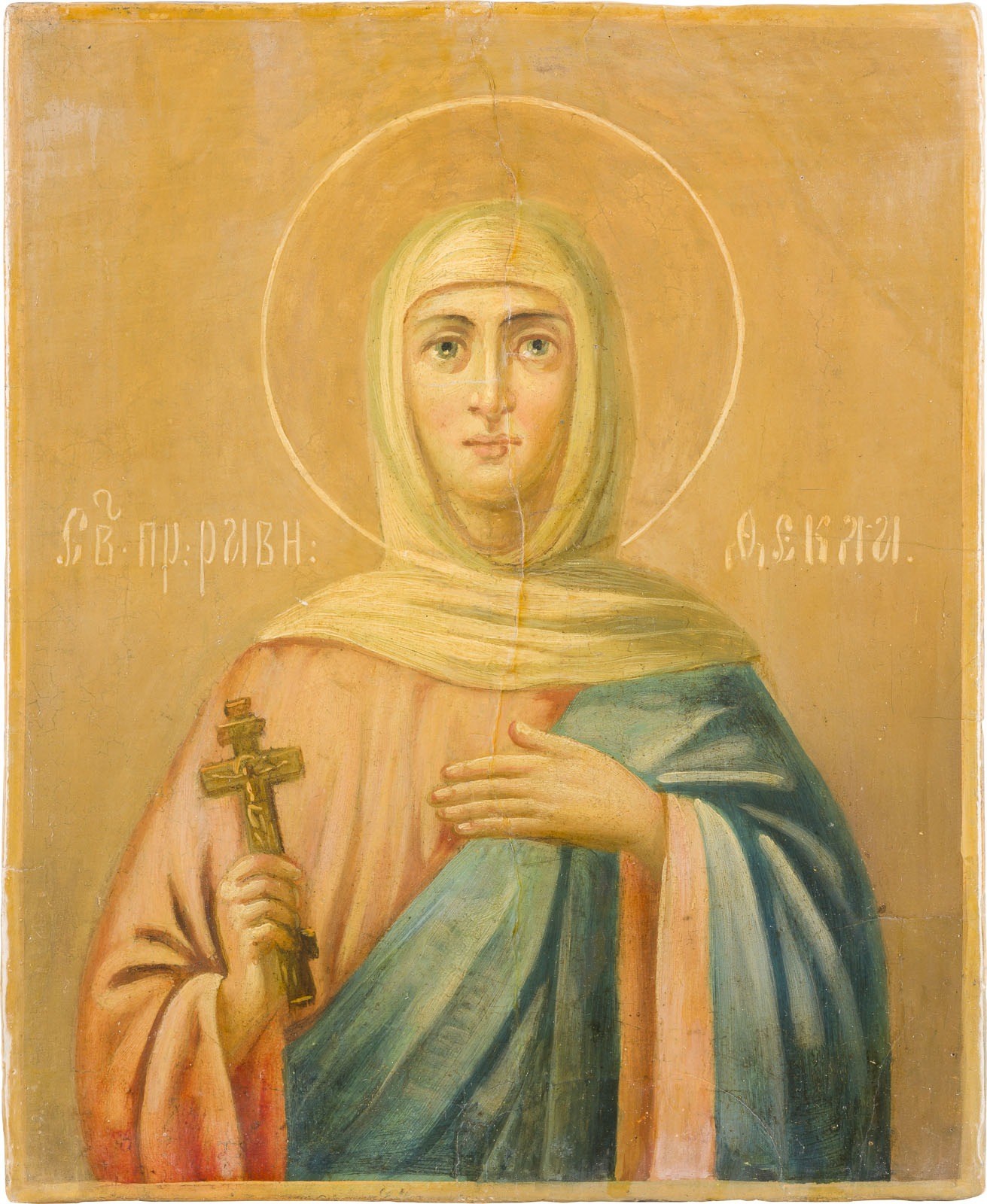 AN ICON SHOWING THE MARTYR ST. THEKLA Russian, mid 19th century Oil on wood panel. Partially restored. 26.5 x 21.9 cm.