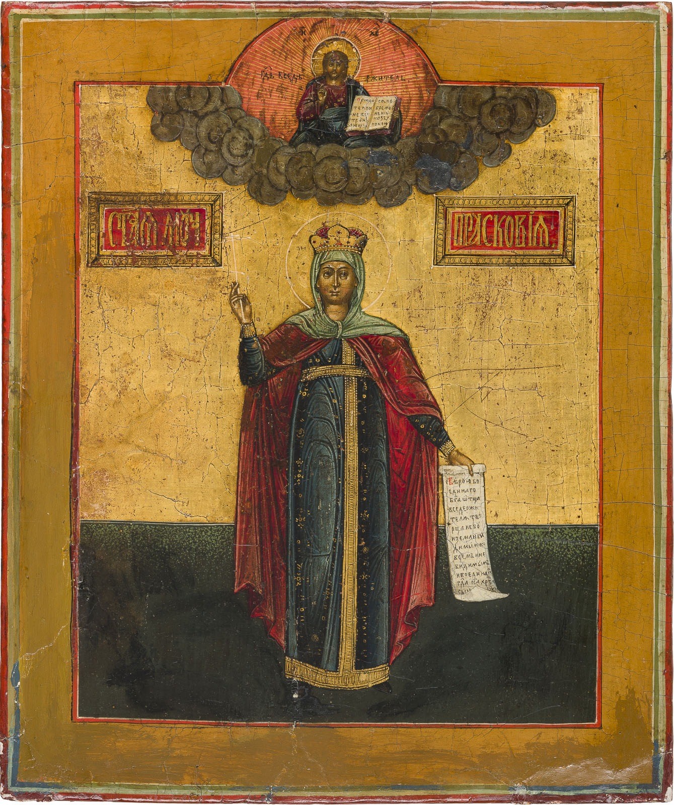 AN ICON SHOWING ST. PARASKEVA Russian, 19th century Tempera on wood panel. Painted in bright colours on gold ground. The borders partially restored. 29.7 x 25 cm.