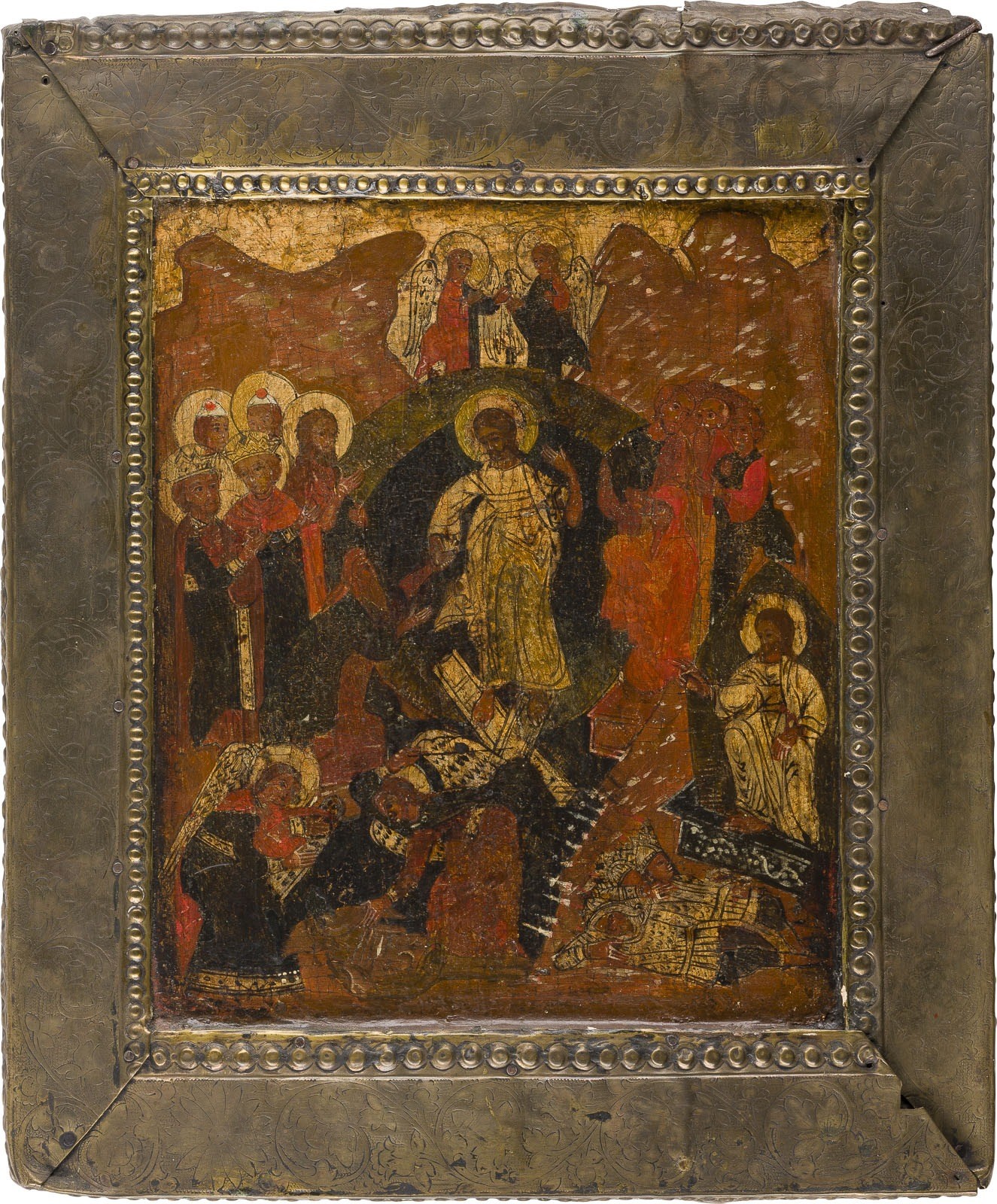 AN ICON SHOWING THE RESURRECTION AND THE DESCENT INTO WITH BASMA Russian, 1st half of the 17th century Tempera on wood panel with kovcheg. The haloes and garments made of silver, covered by a golden lacquer. The borders overlaid with a brass basma engraved with scrolling foliage. Areas of restoration. 32.2 x 27 cm.