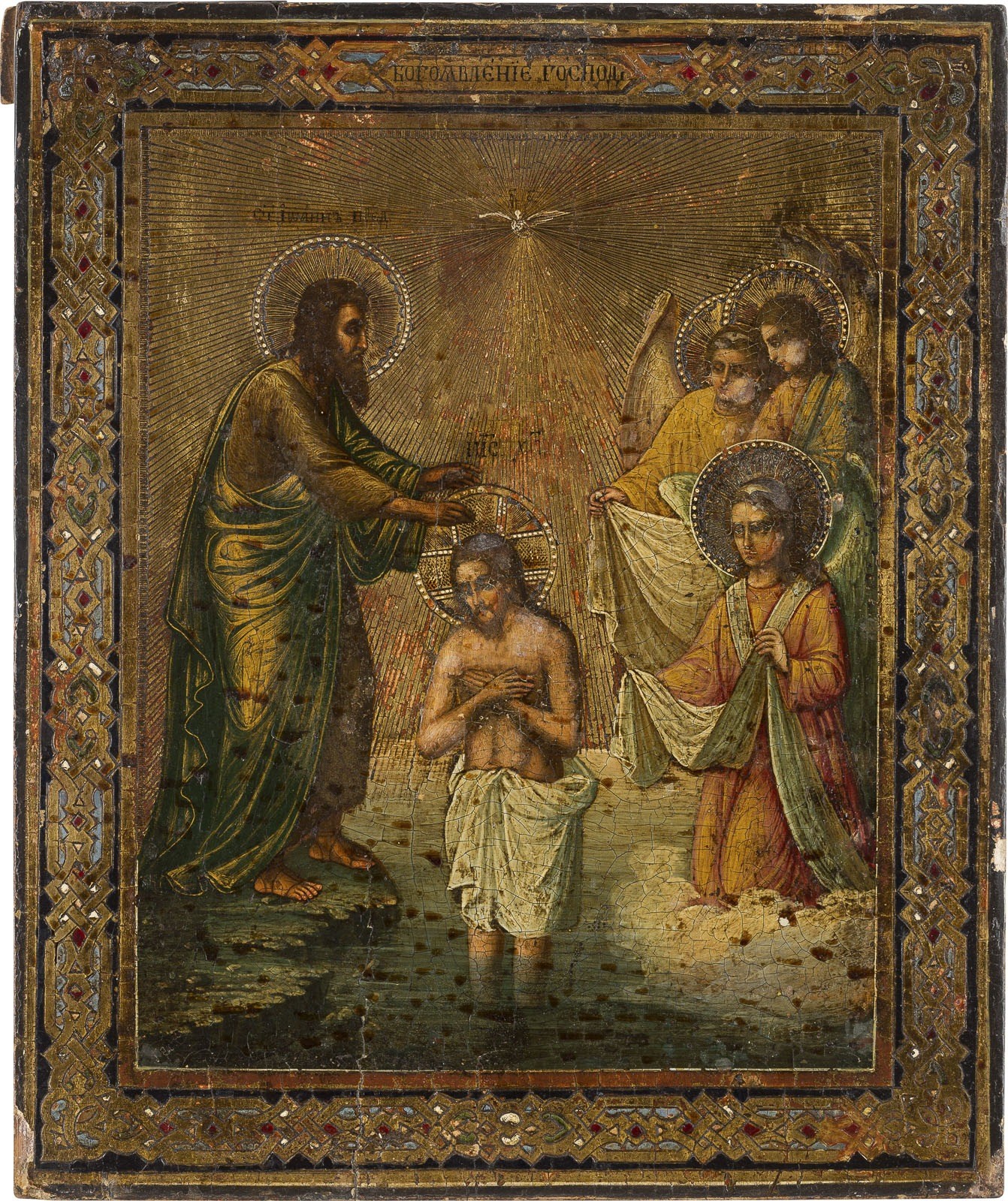 AN ICON SHOWING THE BAPTISM OF CHRIST Russian, late 19th century Tempera on wood panel. The background including the haloes and border made of gold, the stylised decoration emulating contemporary metal oklads. Wearings. 26.5 x 22 cm.