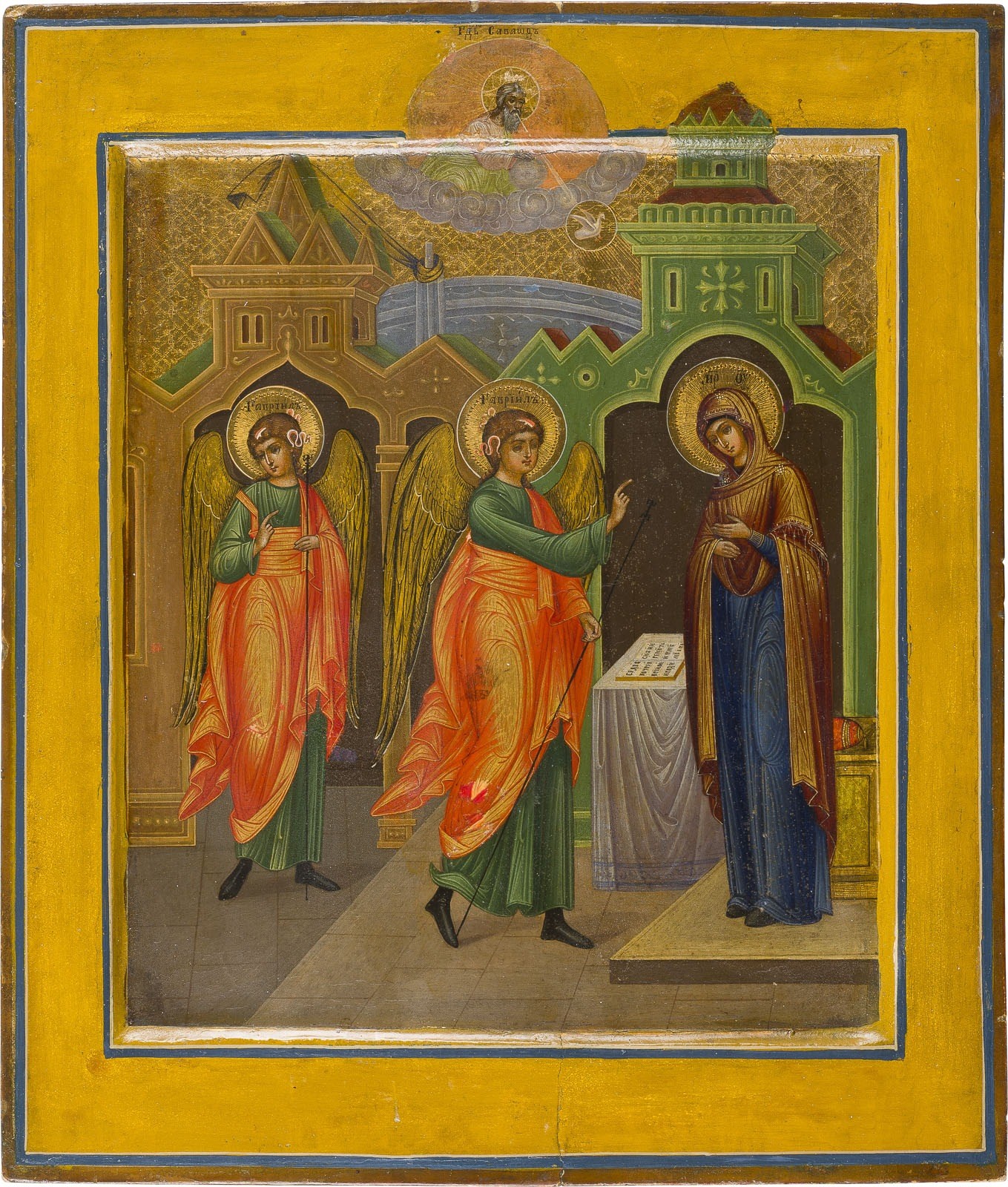 AN ICON SHOWING THE ANNUNCIATION Russian, 2nd half of the 19th century Tempera on wood panel with kovcheg. The haloes and background made of gold, ornately incised. Minor areas of retouching. 31 x 26.5 cm.