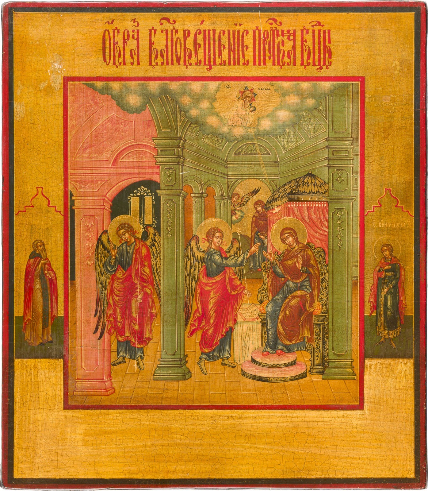 AN ICON SHOWING THE ANNUNCIATION Recent Tempera on wood panel. The haloes and border made of gold. Two selected saints on the borders: Sts. Paisiy and Boniface. 30.6 x 26.4 cm.