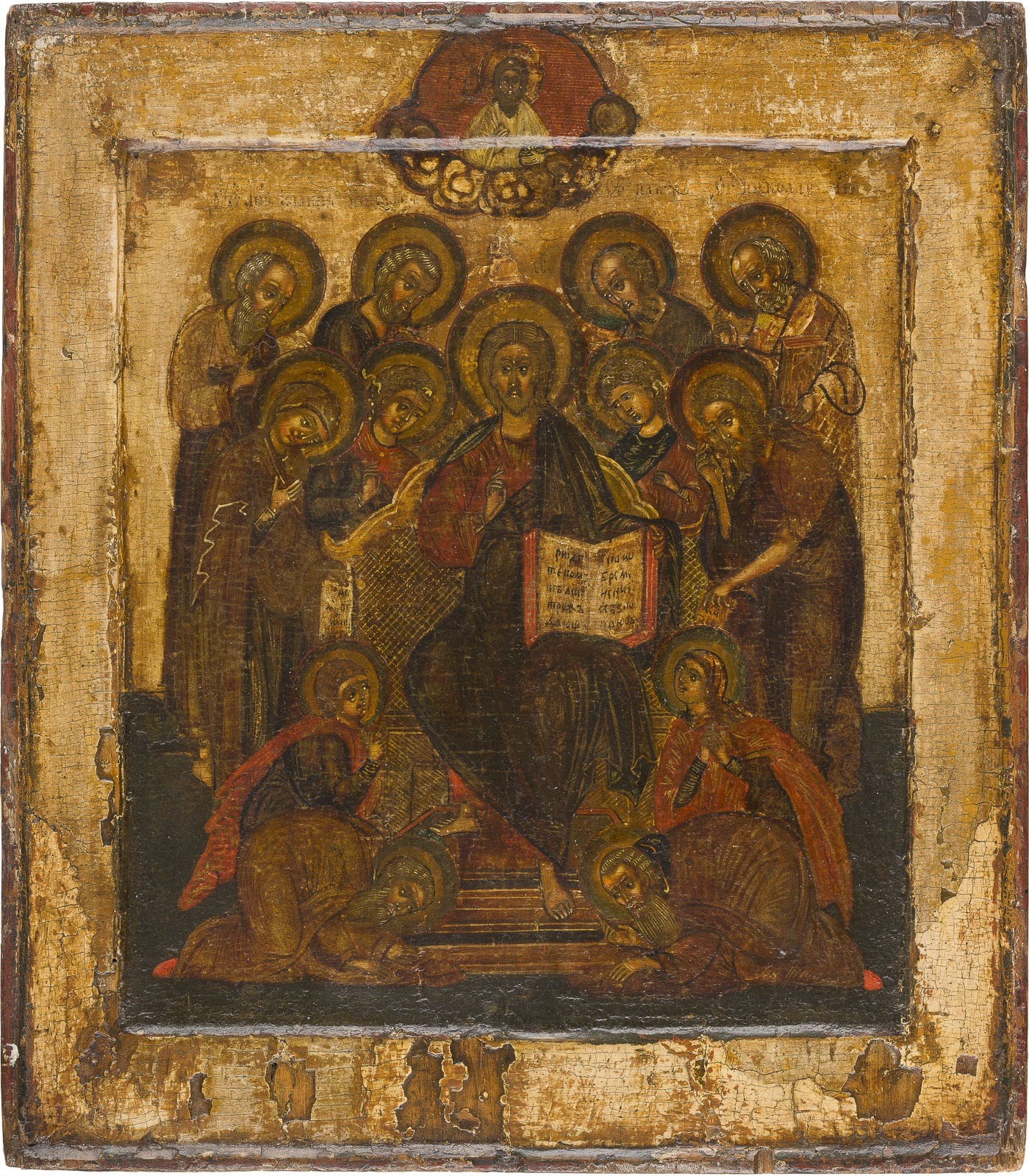AN ICON SHOWING THE EXTENDED DEISIS Russian, 17th century Tempera on wood panel with double kovcheg. The background stripped to gesso, minor losses, partially restored. 30.8 x 27.1 cm.