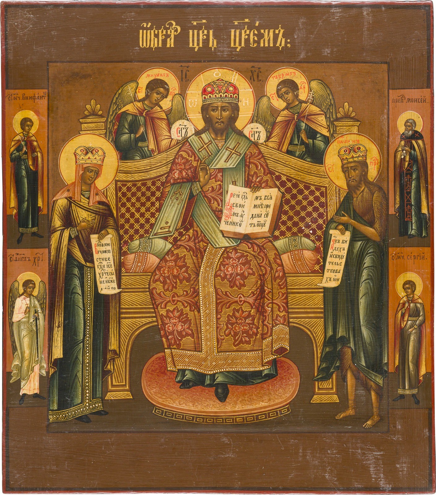 AN ICON OF THE EXTENDED DEISIS Russian, 2nd half of the 19th century Tempera on wood panel with kovcheg. The haloes made of gold. Four selected saints on the borders, the Guardian Angel and St. Boniface among them. Minor areas of retouching. 35.2 x 31 cm.